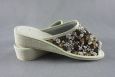 Bardzo wygodne i lekkie kapcie wykonane w 100% z polskich materiałów. Dużym atutem obuwia jest użyta tkanina lniana, z których są wykonane. Cholewka uszyta jest z materiału, który posiada nadruk przedstawiający kolorowe kwiaty, nadając tym samym obuwiu efektownego wyglądu. Wycięcie cholewki w palcach zapewnia wysoki komfort użytkowania. Spody gumowe, nie pozostawiają śladów na podłodze. Wysokość pod piętą około 3,5cm.