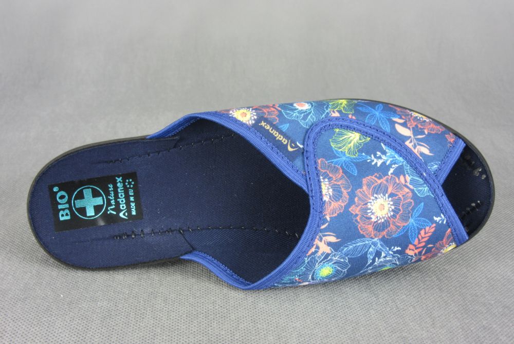Bardzo wygodne obuwie domowe BIO polskiego producenta firmy Adanex. Niewątpliwą zaletą jest ich lekkość, na co składa się zastosowanie lekkich spodów wykonanych z elastycznego tworzywa PU, odpornego na pękanie. Wygoda jest jednym z kluczowych warunków przy wyborze obuwia, którą kierują się klienci. Profilowana i wytrzymała wkładka drelichowa ( bawełniana ) oraz cholewka również z materiału bawełnianego, z efektownie wyglądającym kolorowym nadrukiem, zapewniają komfort i wygodę przez wiele godzin użytkowania. Wycięcie w przedniej części obuwia zapewnia dopływ powietrza, i wraz z użytymi materiałami nie powoduje potliwości stóp. Proponowany model cechuje się ładnym wzornictwem i dobra jakością, przez co użytkowanie jest bardzo przyjemne i dostarcza wielu radości.