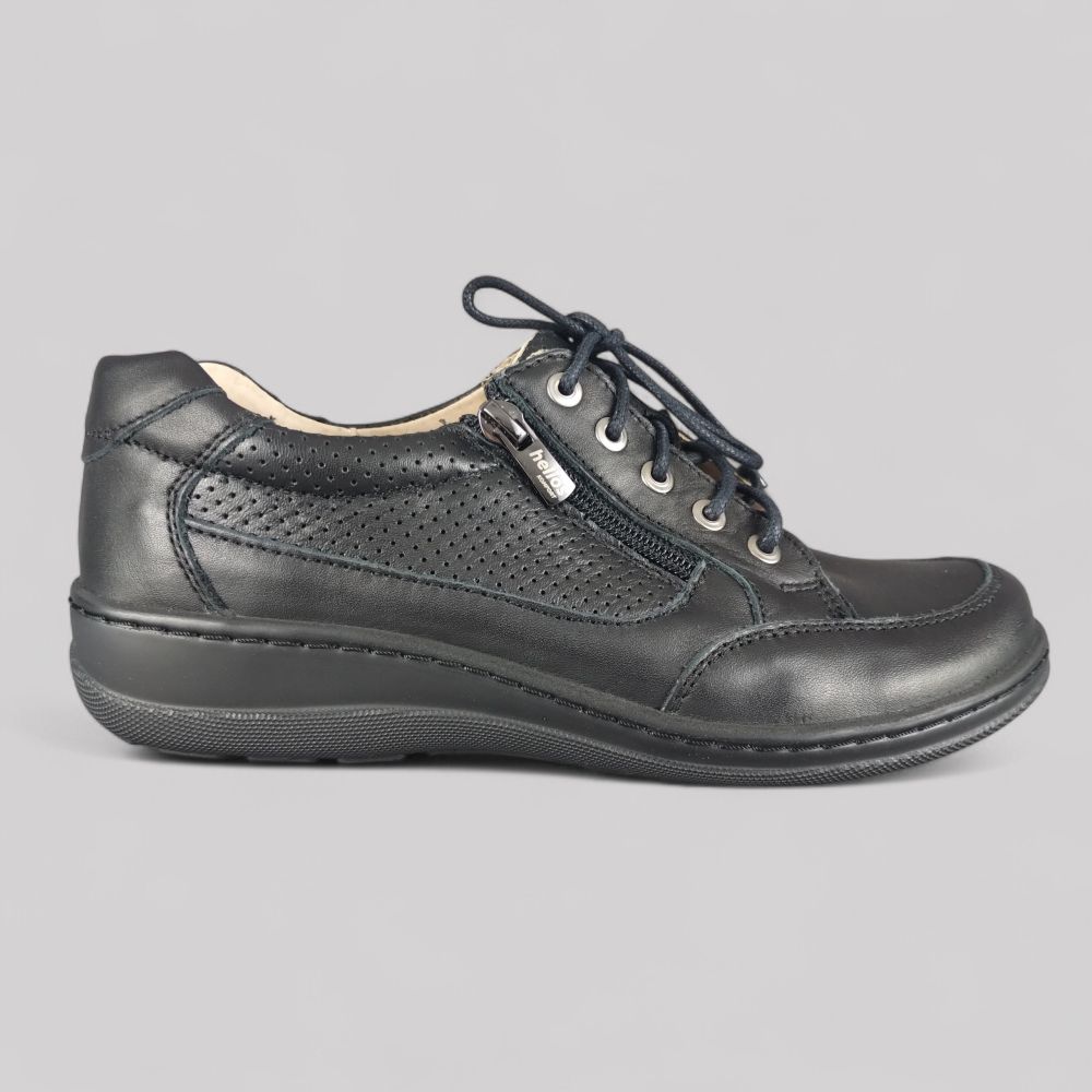 Czarne półbuty Helios 357 to wybór uniwersalny. Ich klasyczny wygląd sprawia, że pasują zarówno do pracy, jak i na zakupy czy spacer. Dzięki wykonaniu w całości ze skóry naturalnej (wierzch i wnętrze), stopa ma zapewnioną idealną wentylację.