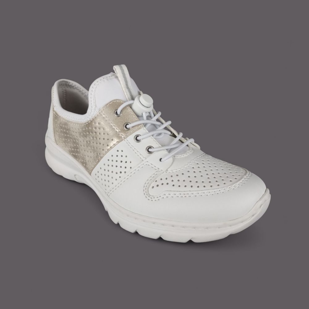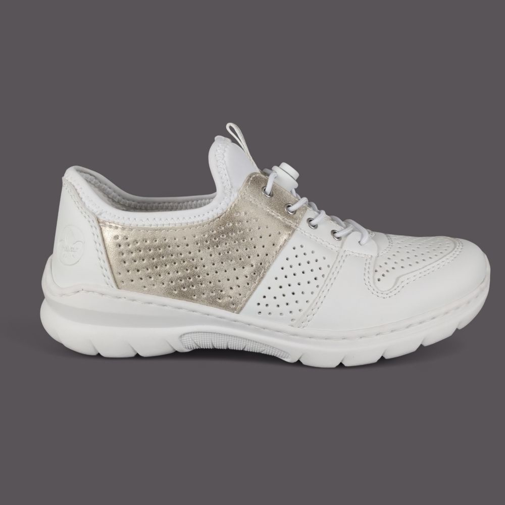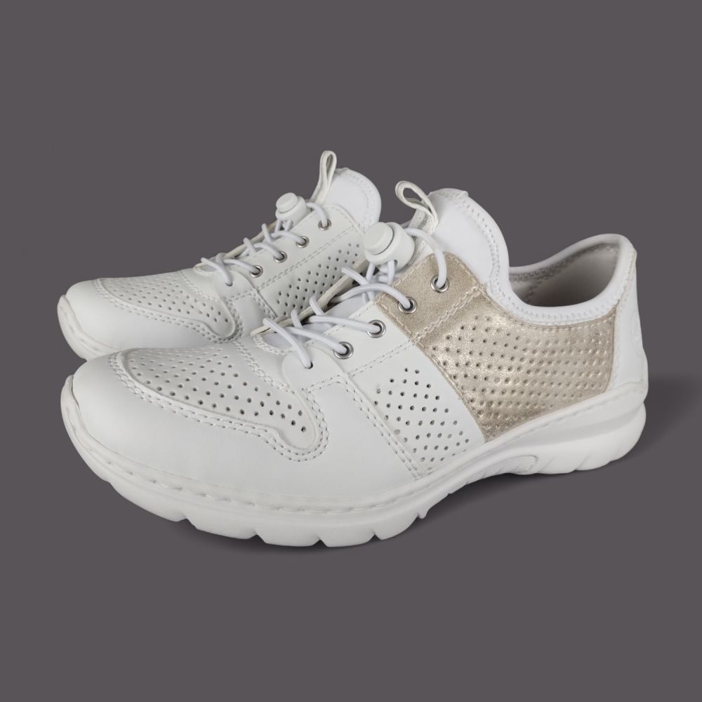 Modne Półbuty Rieker L3254-80 – Biel i Złoto, Wsuwane na Ściągacz