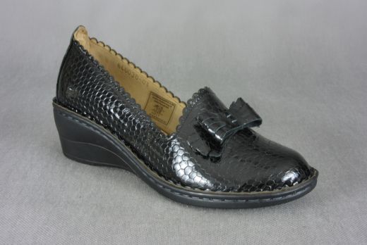 Półbuty damskie na koturnie koloru czarnego marki Manitu. Efektownie wyglądające obuwie dzięki zastosowaniu skóry naturalnej lakierowanej, łudząco przypominającej skórę krokodyla. Ozdobione są ładnie prezentująca się kokardą, co dodatkowo podnosi atrakcyjność tych bucików. Niewątpliwym ich atutem jest wygoda, na co składa się odpowiedni dobór właściwie wyprofilowanych spodów oraz miękkie wkładki ze skóry naturalnej. Koturna nie jest wysoka, ale zapewni odpowiedni podwyższenie pod piętą. Półbuty prezentują się bardzo okazale i będą stanowiły idealne uzupełnienie stylizacji na wyjątkowe okazje.