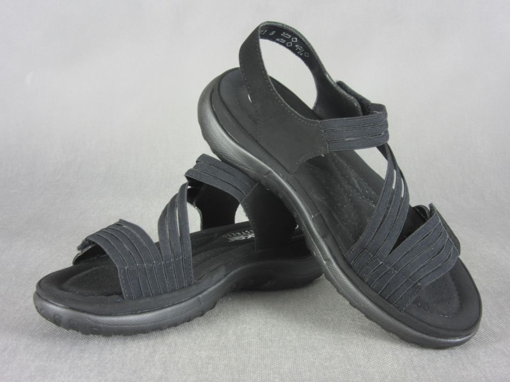 Lekkie i wygodne sandały damskie marki Rieker na lato. Obuwie stworzone na długie piesze wędrówki, na letnie spacery, ale również jako buty do codziennego użytkowania. Podstawowym ich atutem jest wygoda, na którą składa się technologia produkcji oraz użyte materiały. W większości fasonów tego producenta zastosowano innowacyjny system Rieker Antistress. Amortyzuje on stopy od palców aż po pięty, dbając tym samym o stan stawów oraz pochłania mikrowstrząsy. Dodatkowo wkładka została odpowiednio wyprofilowana pod kształt stopy, co wyczuwa się zaraz po założeniu ich na nogi. Cholewka została zaprojektowana w taki sposób, aby maksymalnie ułatwić dopasowanie do kształtu stopy. Dlatego też pomocne okażą się w tym elastyczne gumki zapinane na rzepy. Sandały są koloru czarnego, więc nie będzie problemu z dopasowaniem ich do różnej letniej stylizacji.