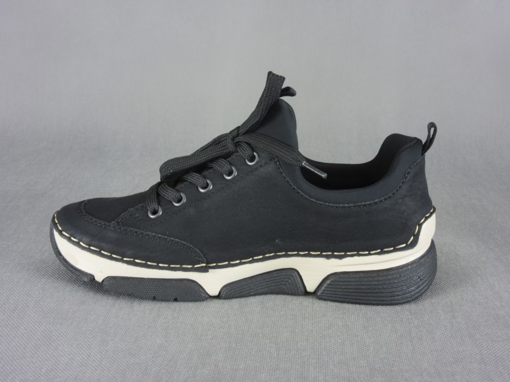 Półbuty damskie Rieker fasonem zbliżone są do obuwia sportowego wkoloru czarnego.