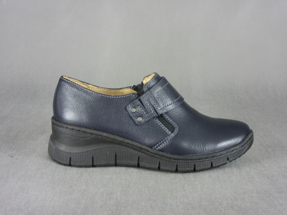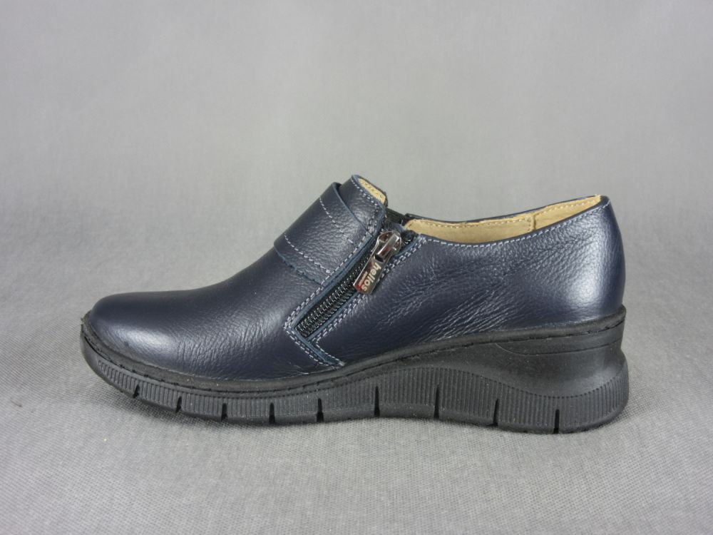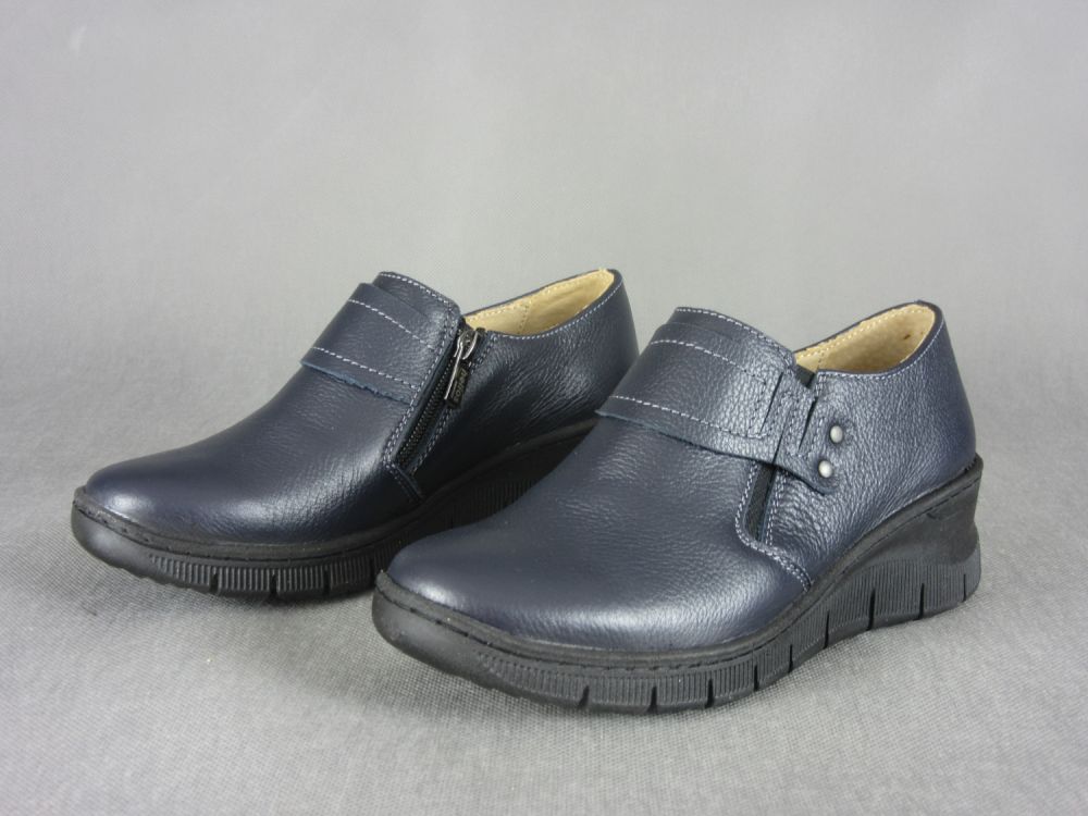 Skórzane półbuty damskie na koturnie polskiego producenta firmy Helios, koloru granatowego. Wygodne obuwie do codziennego chodzenia. Wykonane zostało z naszych krajowych materiałów, co znacząco podnosi komfort jego użytkowania. Miękka skóra naturalna, która idealnie dopasowuje się do kształtu stóp, zapewnia wysoki komfort każdego dnia. Zaraz po założeniu ich na nogi wyczuwa się, że to będzie dobry wybór. Cholewka nie posiada żadnych przeszyć w miejscu, gdzie na stopach pojawiają się haluksy. Tak więc nic nie będzie uwierało i ugniatało podczas chodzenia. Wkładka również jest ze skóry. Razem z odpowiednio wyprofilowaną podeszwą dają przyjemne odczucia. Podwyższenie pod piętą wyeliminuje efekt przechyłu ciała do tyłu. Buty zapinane są na zamek błyskawiczny. W górnej części wszyta została i ładnie ukryta gumka. Umożliwi to dopasowanie obuwia do nóg o wyższym podbiciu stóp. Proponowany model, to doskonała propozycja na jesienne dni, ciepłą zimę i budzącą się do życia wiosnę.