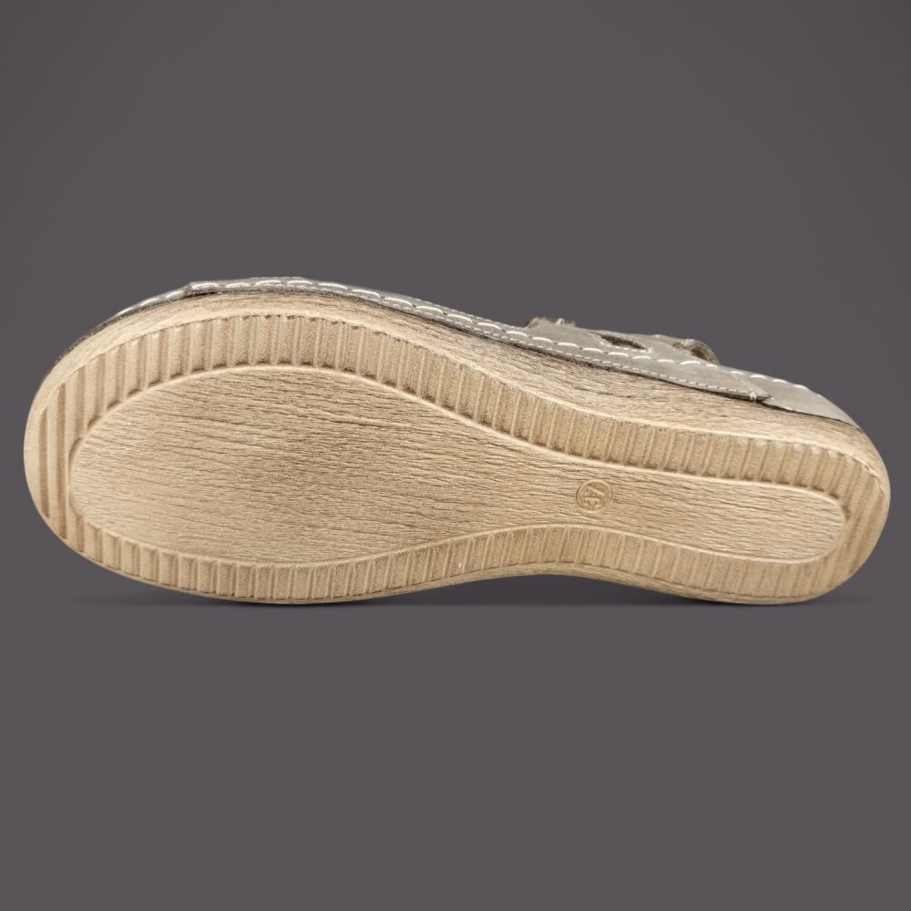 Elastyczna podeszwa w odcieniu naturalnego drewna jest lekka i amortyzująca — nie obciąża stawów i nie wydaje hałasu podczas chodzenia. Delikatna bieżnia zapewnia przyczepność na różnych nawierzchniach. Beżowo-brązowa kolorystyka podeszwy harmonijnie dopełnia całość buta.