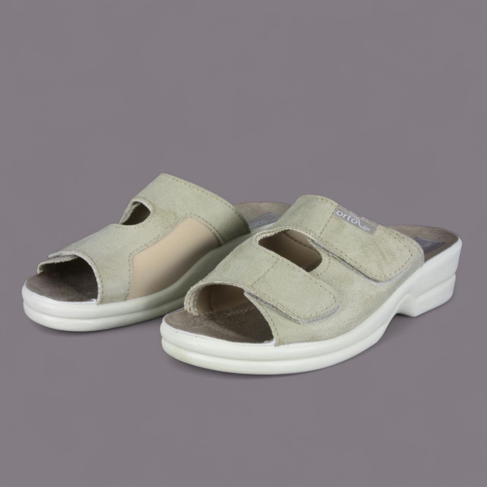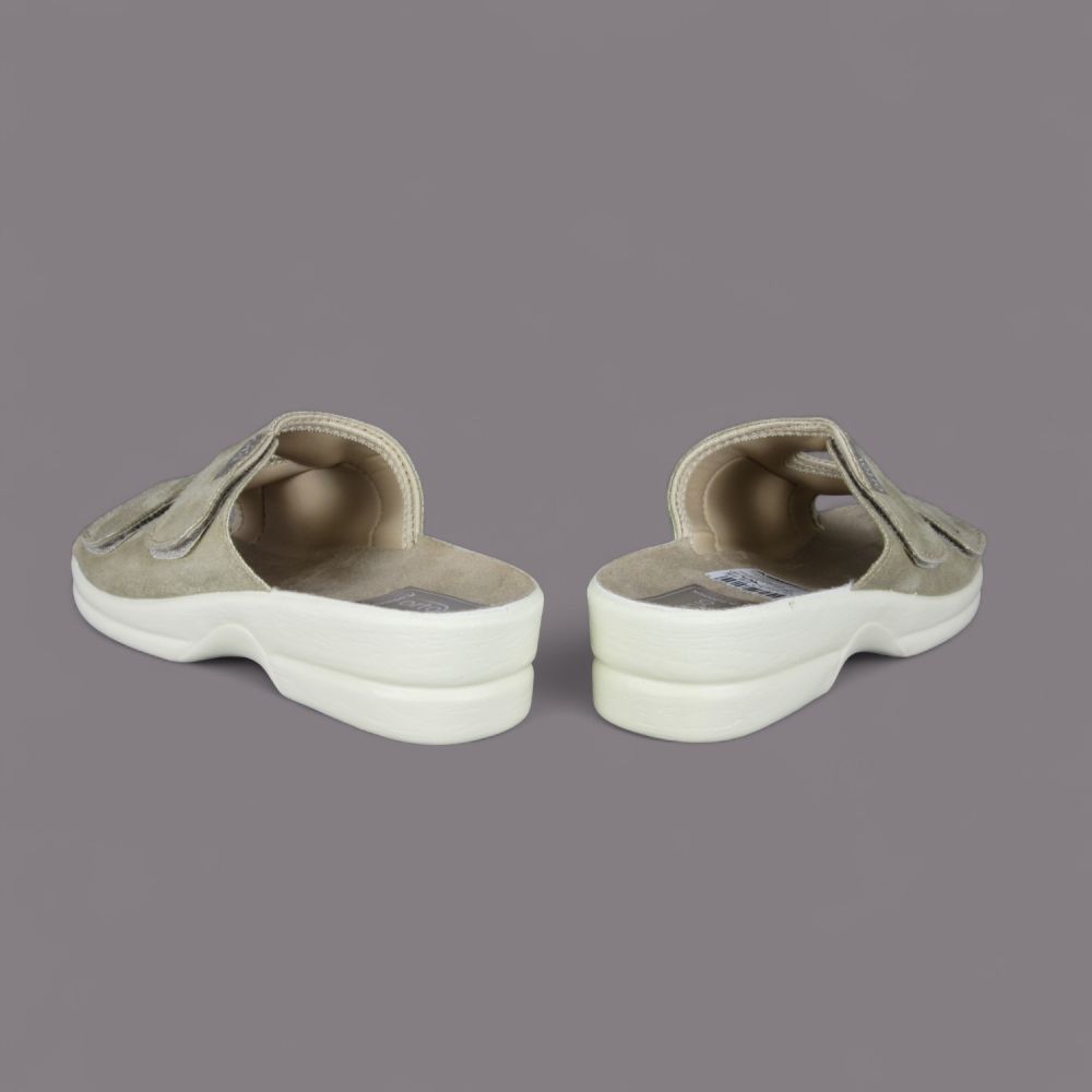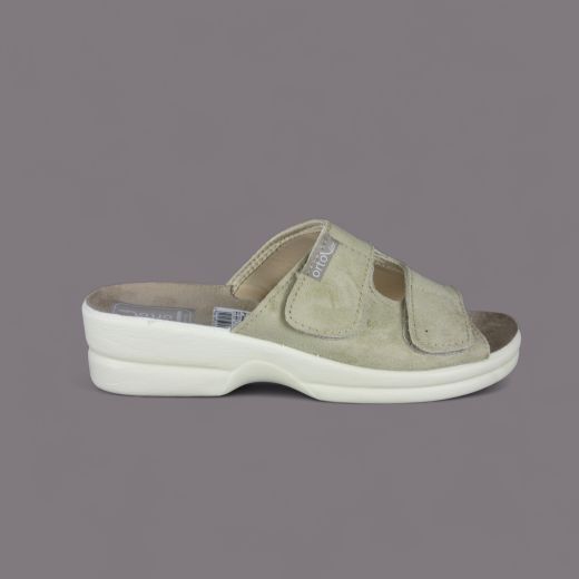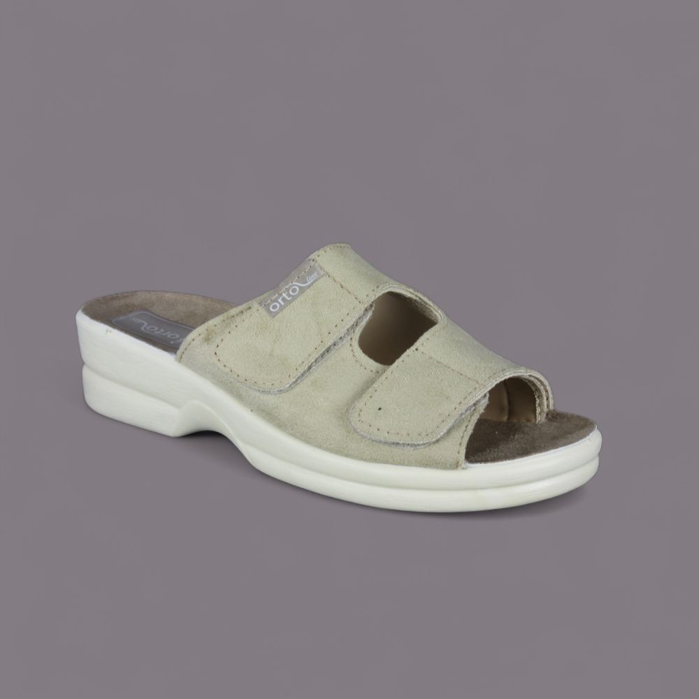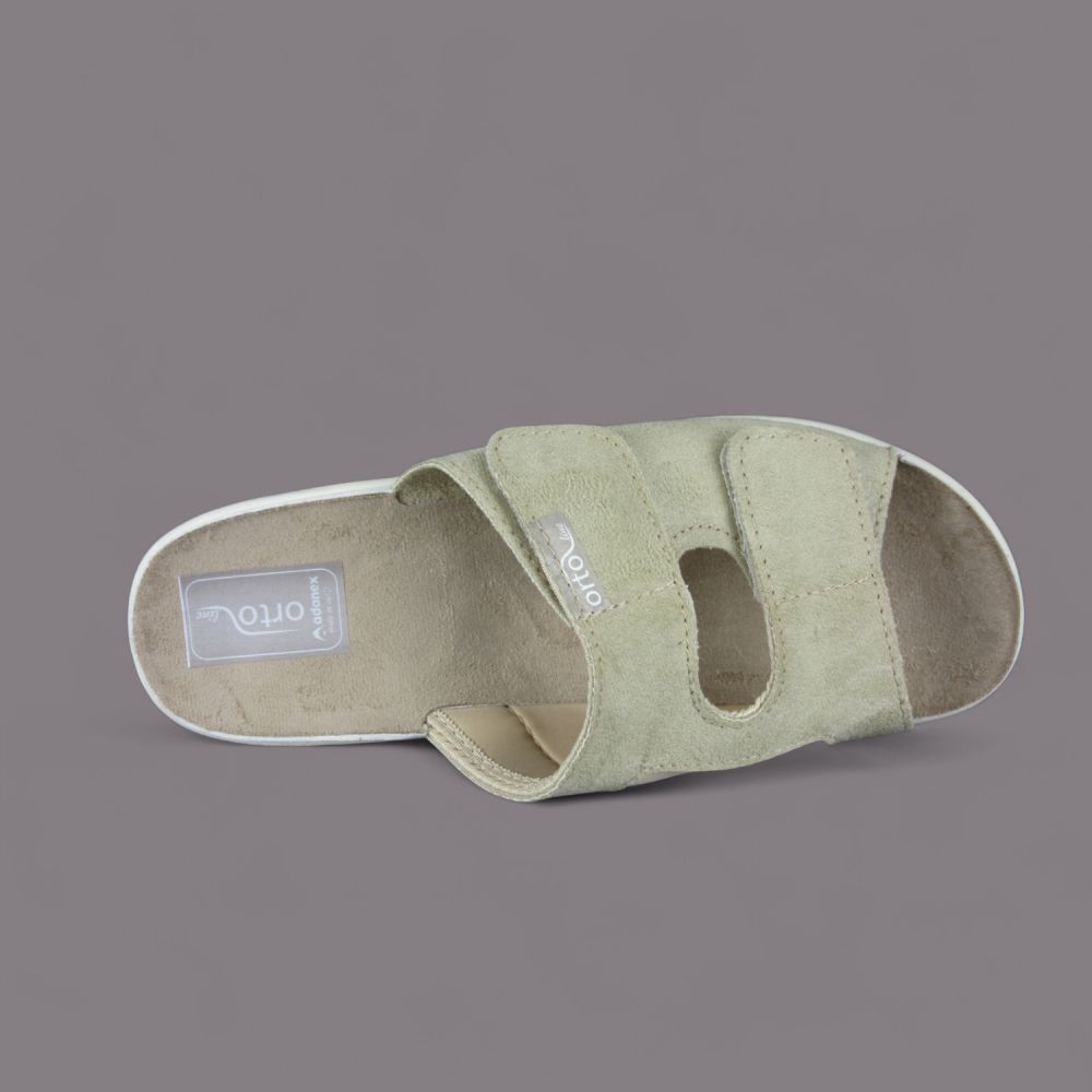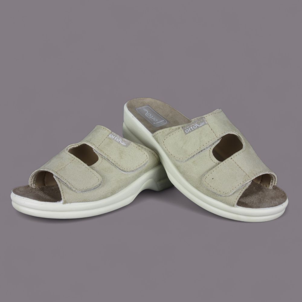 Oto wyjątkowe klapki damskie Adanex, ze specjalnej zdrowotnej linii Orto line, w eleganckim beżowym kolorze, które łączą w sobie zdrowotne właściwości oraz stylowy design. Zapewniające wygodę użytkowania, klapki te zostały zaprojektowane z myślą o osobach z problemami ortopedycznymi, w tym z haluksami.