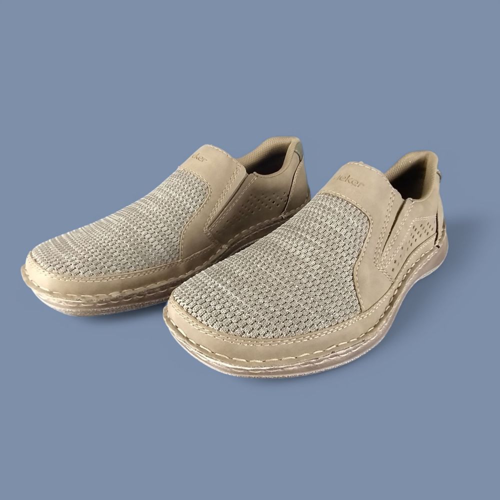 Półbuty męskie Rieker w kolorze beżowym to doskonałe połączenie stylu i komfortu. Wierzchnia część obuwia została wykonana z tekstylnego materiału oraz ekologicznej skóry nubukowej, co nadaje im elegancki, a zarazem nowoczesny wygląd. Dodatkowo, od wewnętrznej i zewnętrznej strony zastosowano perforację, co zapewnia przewiewność i korzystnie wpływa na cyrkulację powietrza wewnątrz butów.