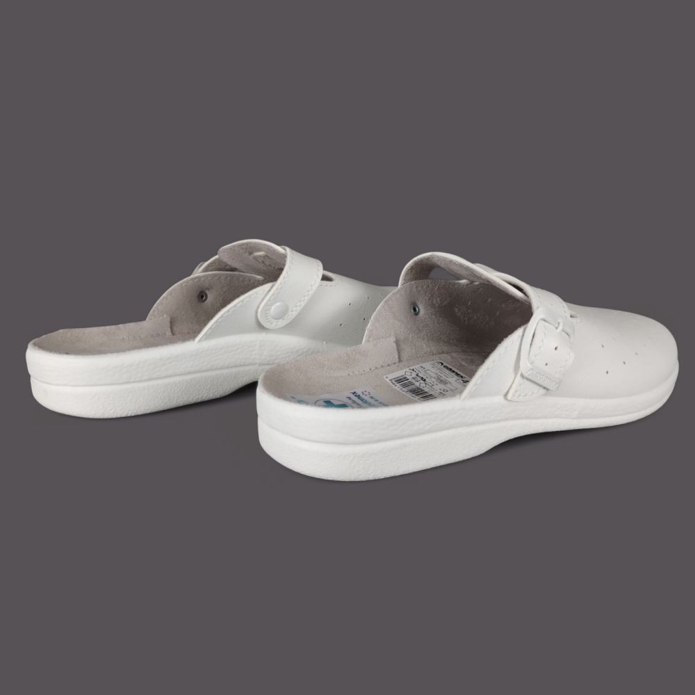 Klapki męskie Adanex w klasycznym białym kolorze to idealne rozwiązanie dla osób poszukujących wygody i wsparcia dla stóp podczas długich godzin pracy. Dzięki lekkim podeszwom PER PEDES o anatomicznym profilu, zapewniają doskonałą amortyzację i odciążenie, co jest szczególnie ważne dla osób pracujących w służbie zdrowia czy na kuchni. Sprężysta i odpowiednio gruba podeszwa gwarantuje komfort nawet podczas wielogodzinnego stania.