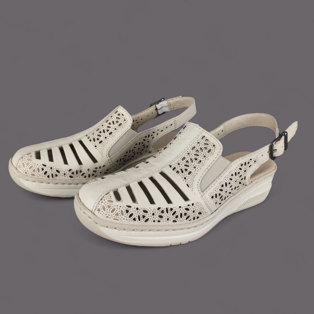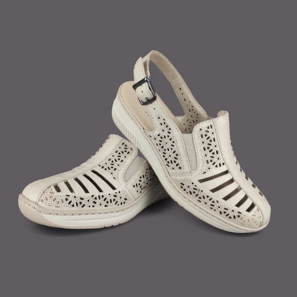Wierzch buta wykonano z wysokiej jakości, miękkiego materiału skóropodobnego. Cholewka zdobiona jest efektownym, ażurowym wzorem. Te liczne otworki nie tylko pięknie wyglądają, ale pełnią funkcję wentylacji, zapewniając stopom dopływ powietrza w ciepłe dni. Fason z zakrytymi palcami to doskonała alternatywa dla klasycznych sandałów – chroni palce przed urazami i dodaje butom elegancji.