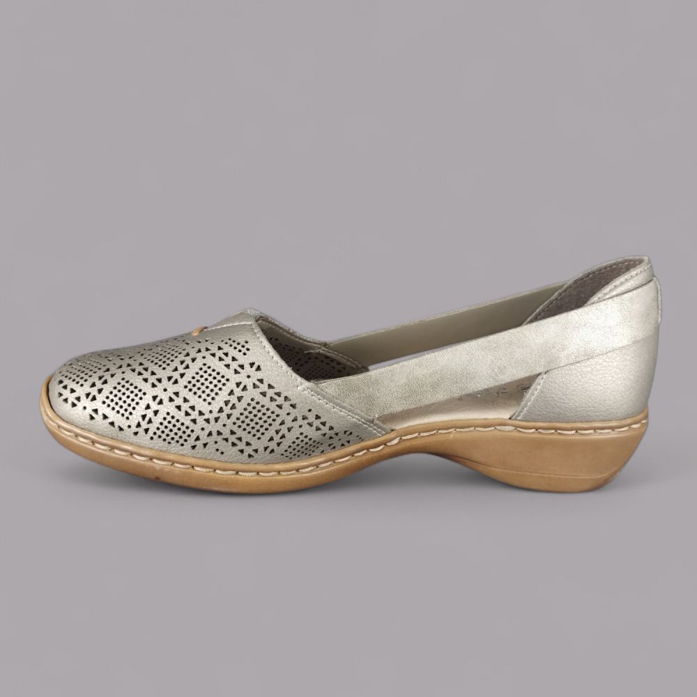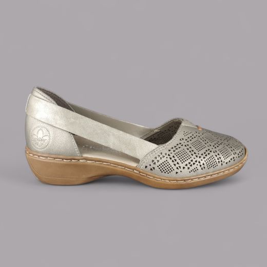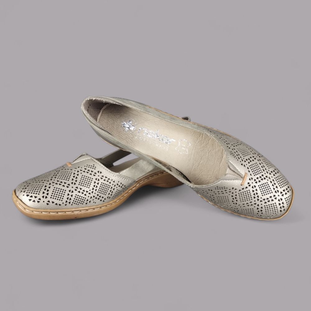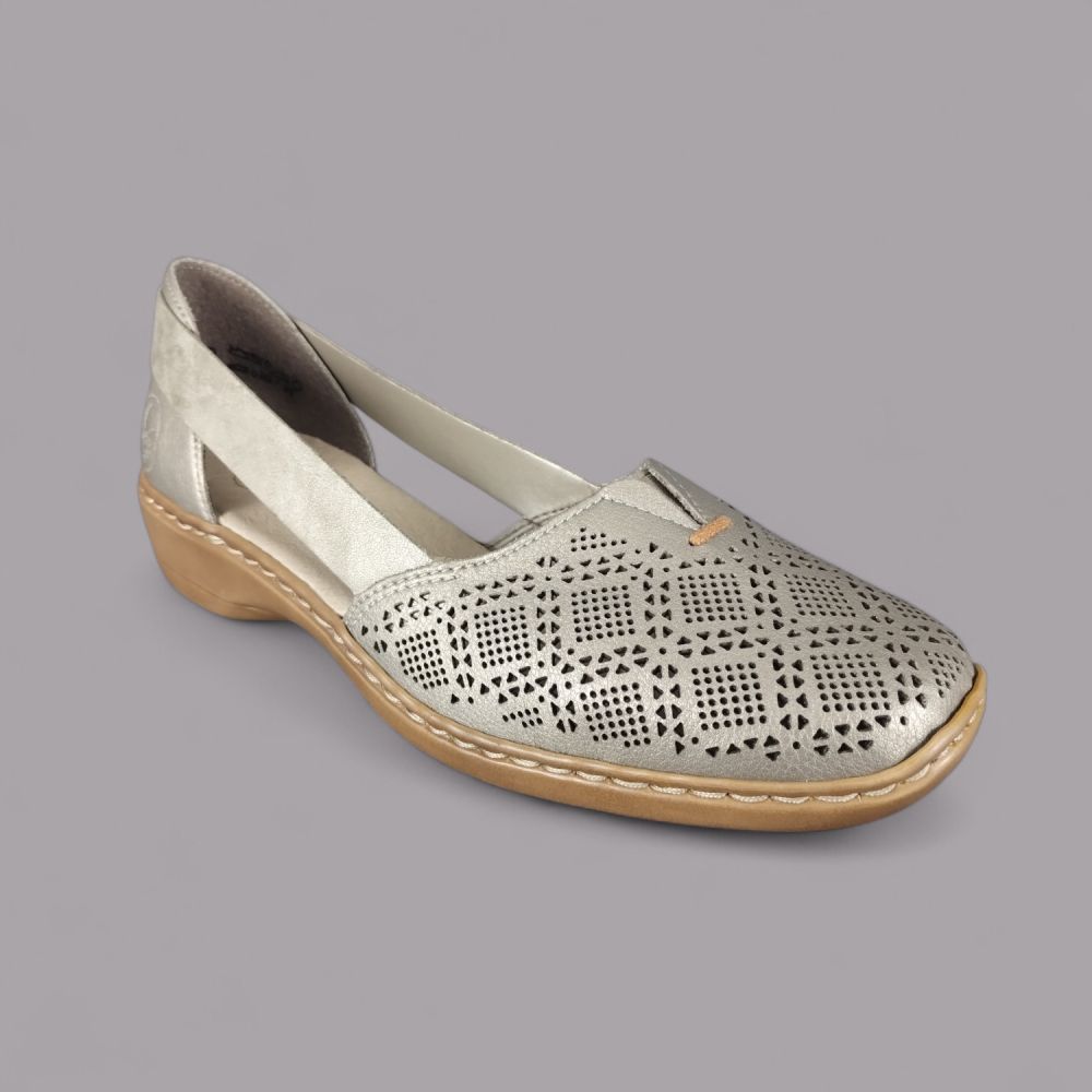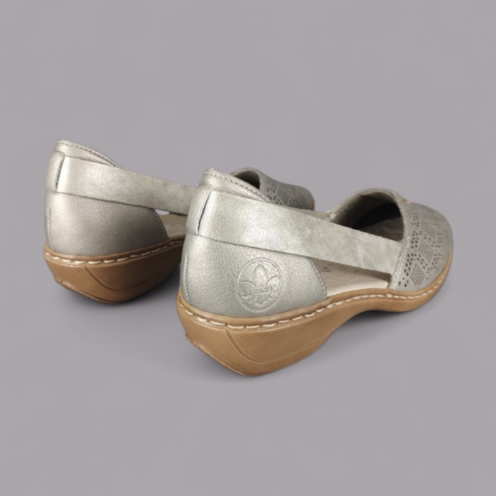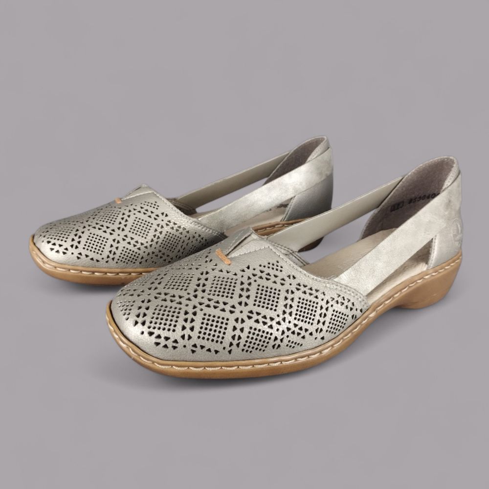 Półbuty Rieker 41351-90 Srebrne – Skóra Naturalna, Ażur i Gumka na Podbiciu