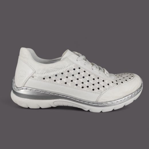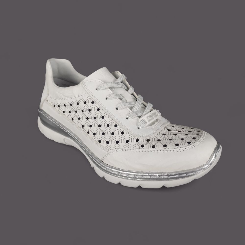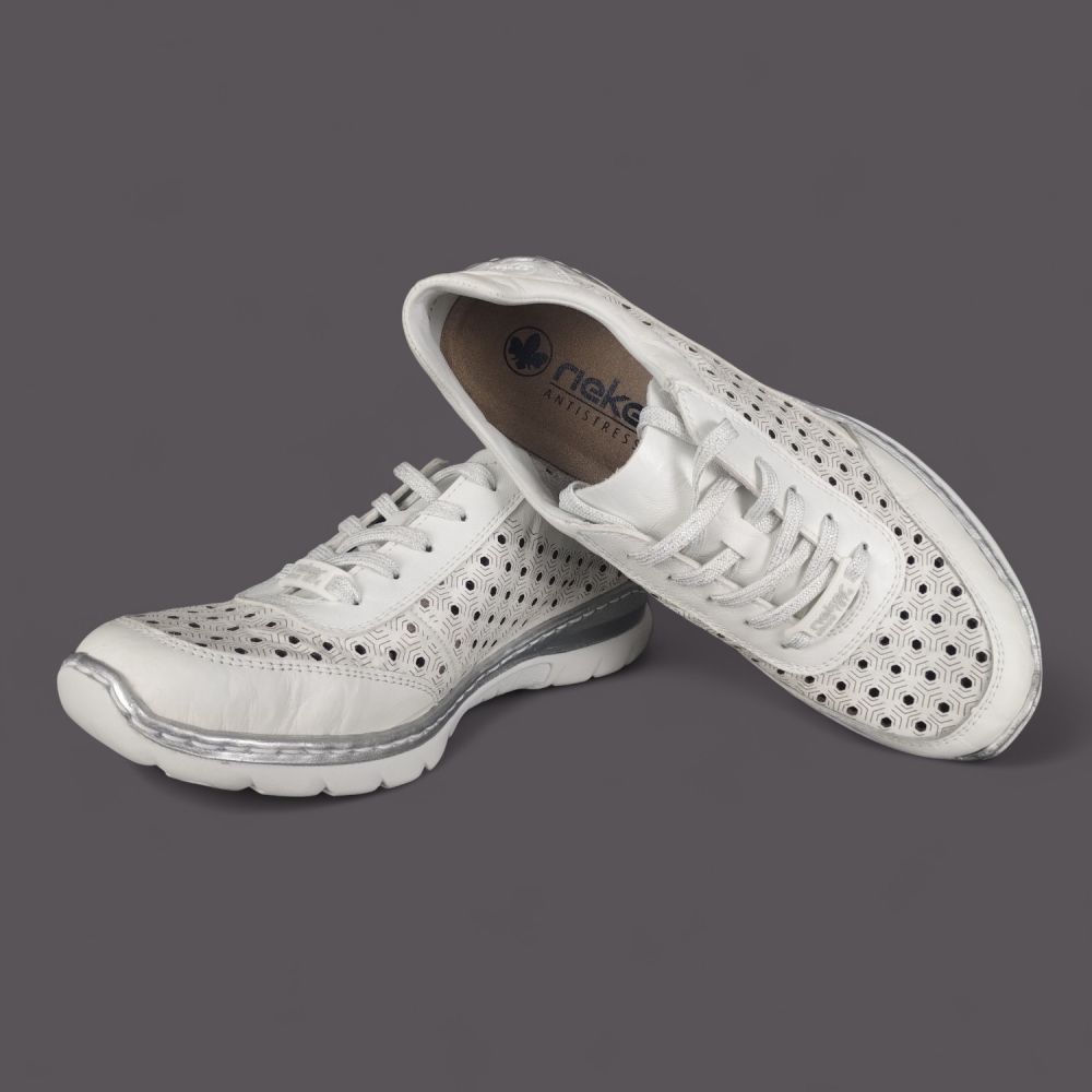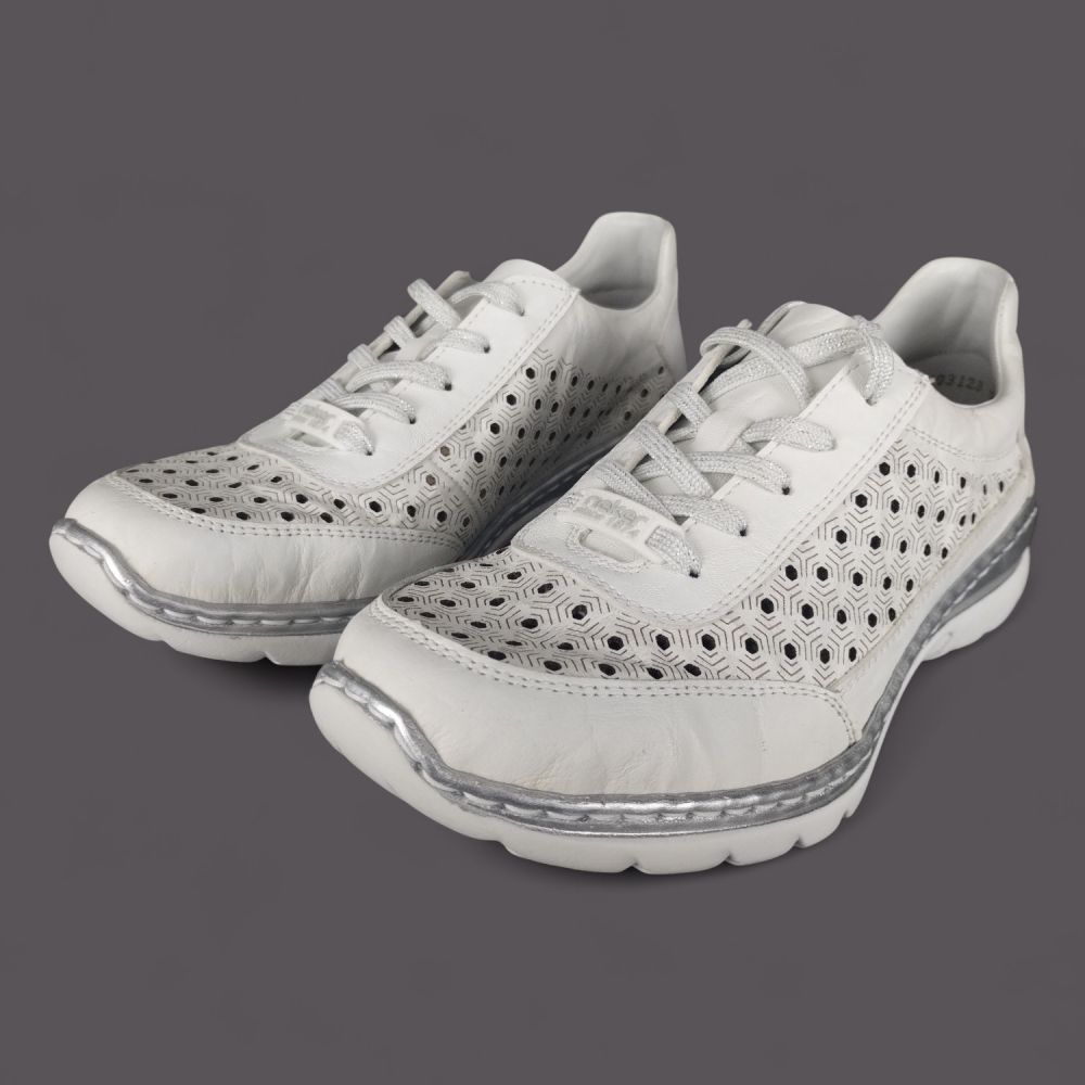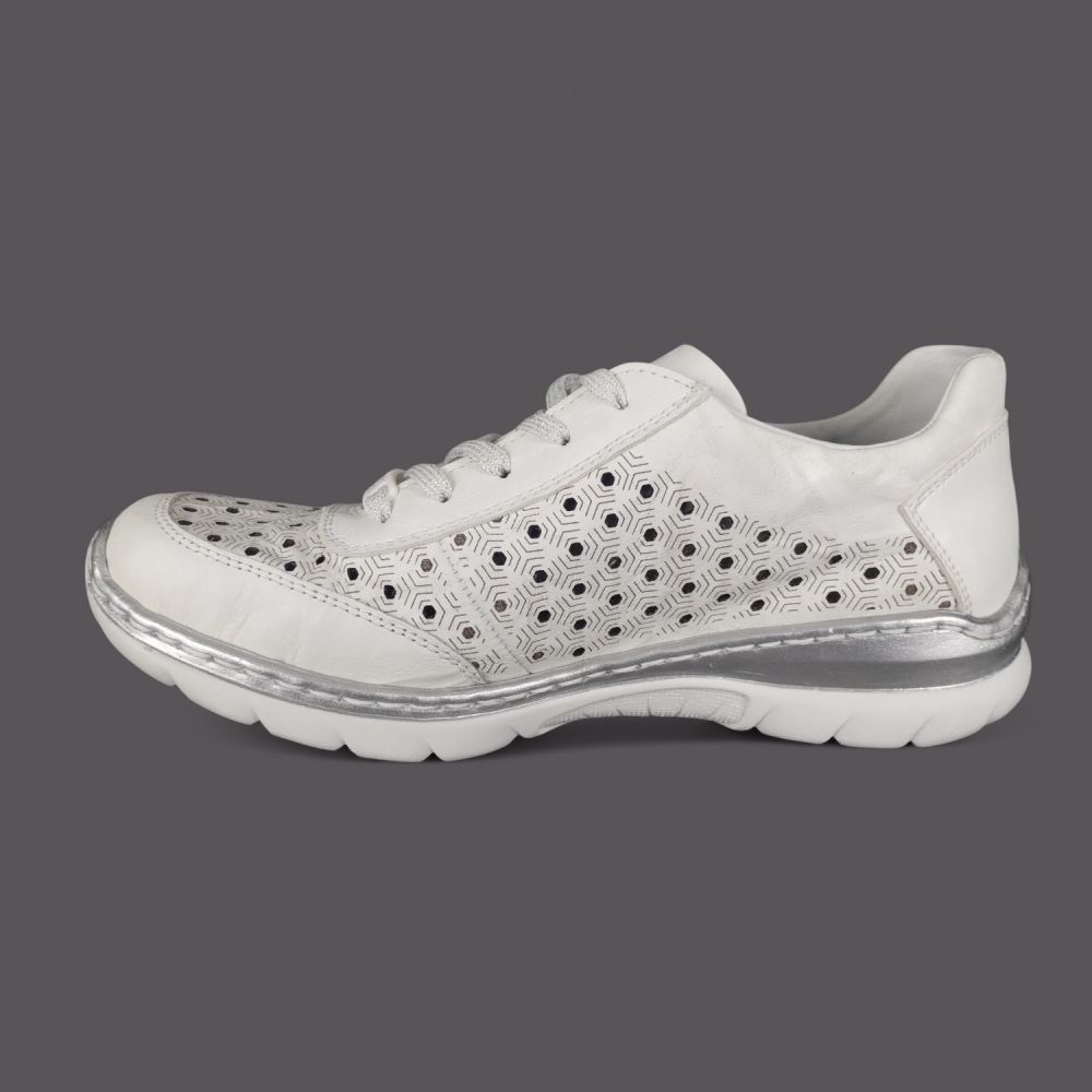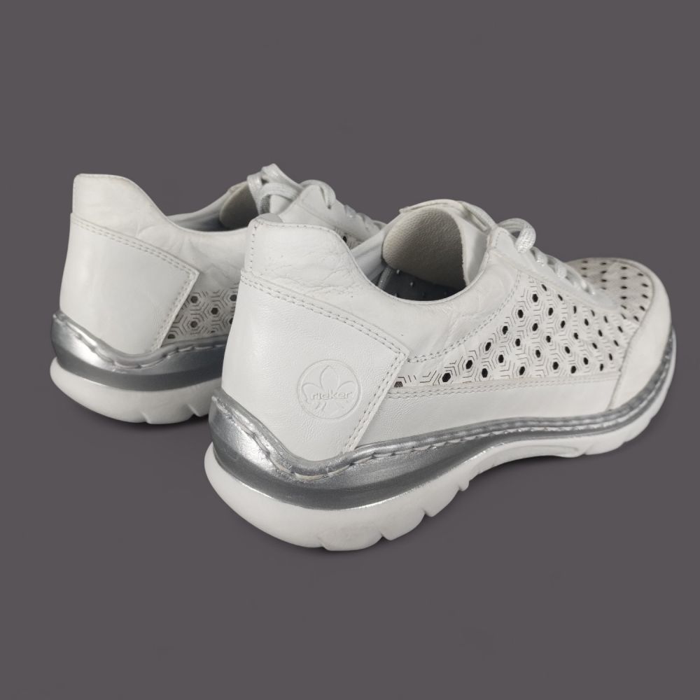 Szukasz lekkich białych półbutów ze skóry naturalnej na lato, które są przewiewne, wygodne i wyglądają stylowo? Model Rieker L3217-80 w kolorze białym z geometryczną perforacją w kształcie plastra miodu, srebrnymi detalami i systemem Antistress to but który łączy sportowy wygląd z komfortem całodniowego noszenia.