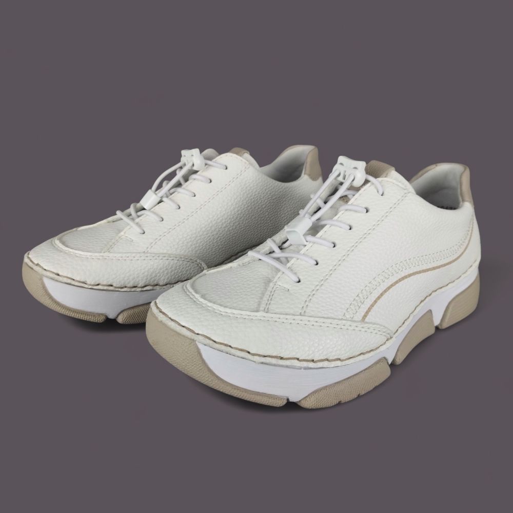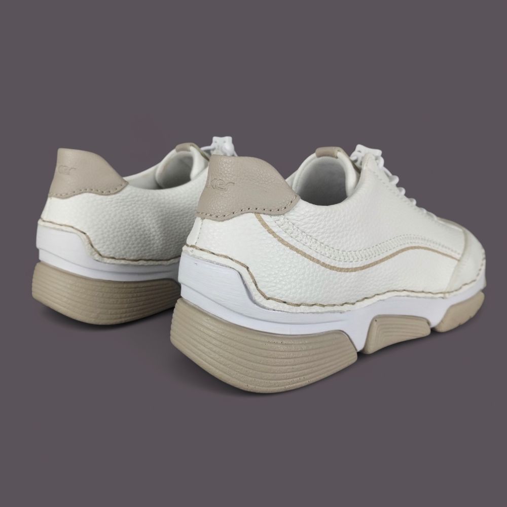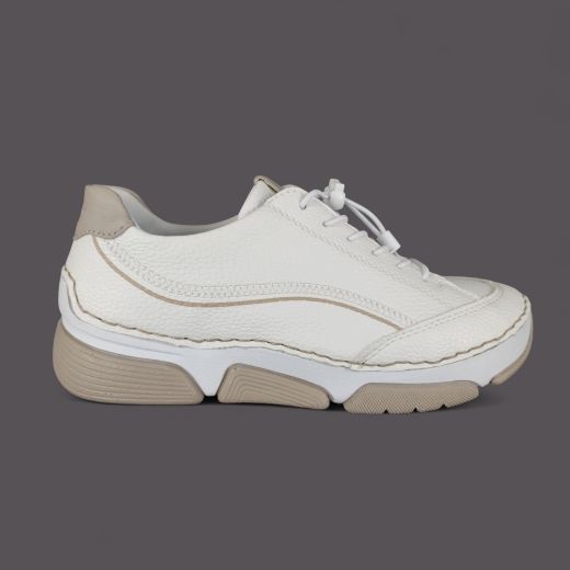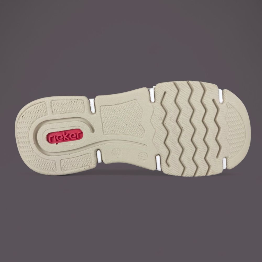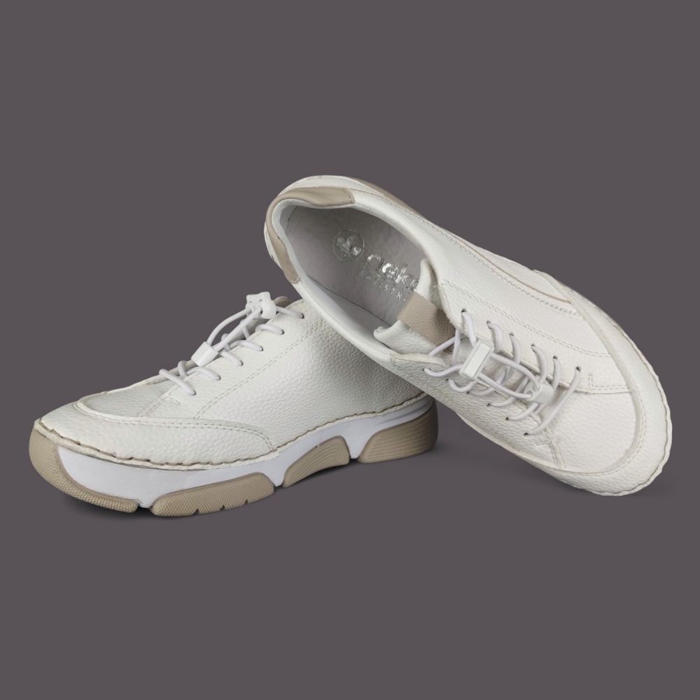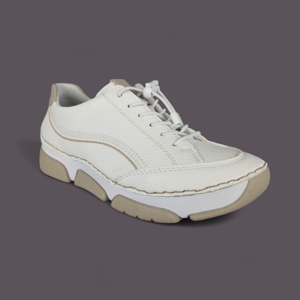 Masywna rzeźbiona podeszwa, fakturowana ekoskóra z naturalnym ziarnem i beżowe detale które ocieplają biel — model Rieker 45696-80 to damski chunky sneaker który łączy modny, wyrazisty wygląd z filozofią Antistress. But który nie boi się zwracać uwagi, a przy tym nosi się wyjątkowo wygodnie.