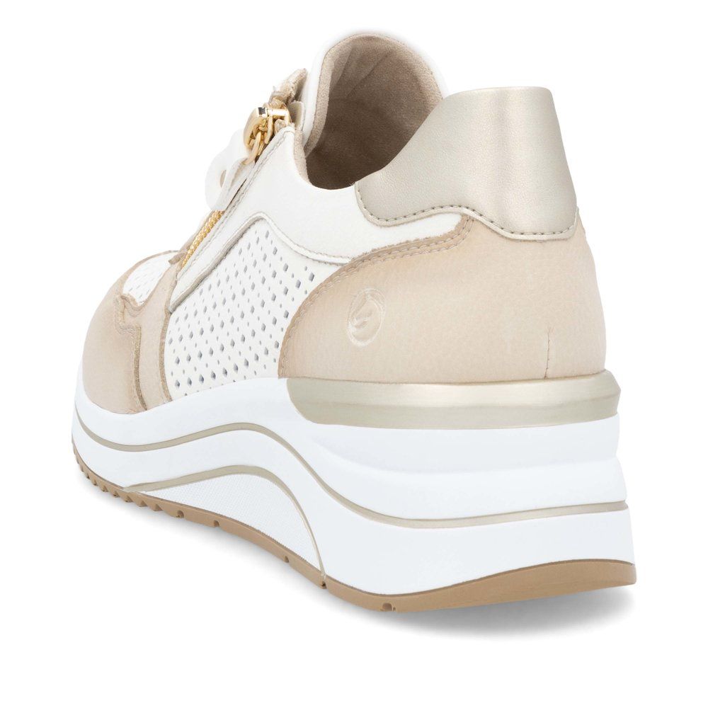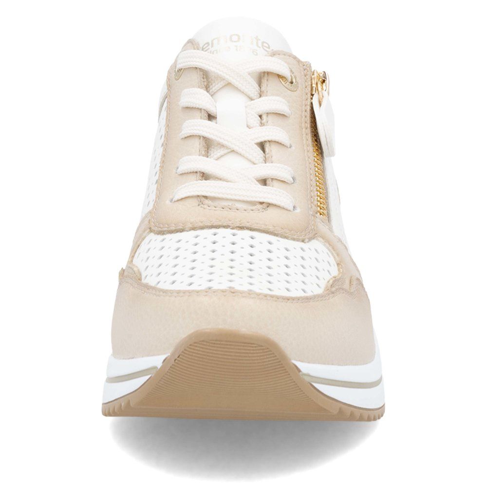 Koturna 5cm, złoty zamek boczny i skóra naturalna z kwadratową perforacją — model Remonte D0T14-81 to sportowy półbut który łączy aktualny trend platformy z zaawansowaną technologią lekkości Lite'n Soft. But który dodaje wzrostu i pewności siebie, a przy tym waży jak papierowa.