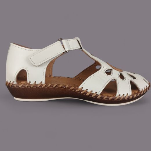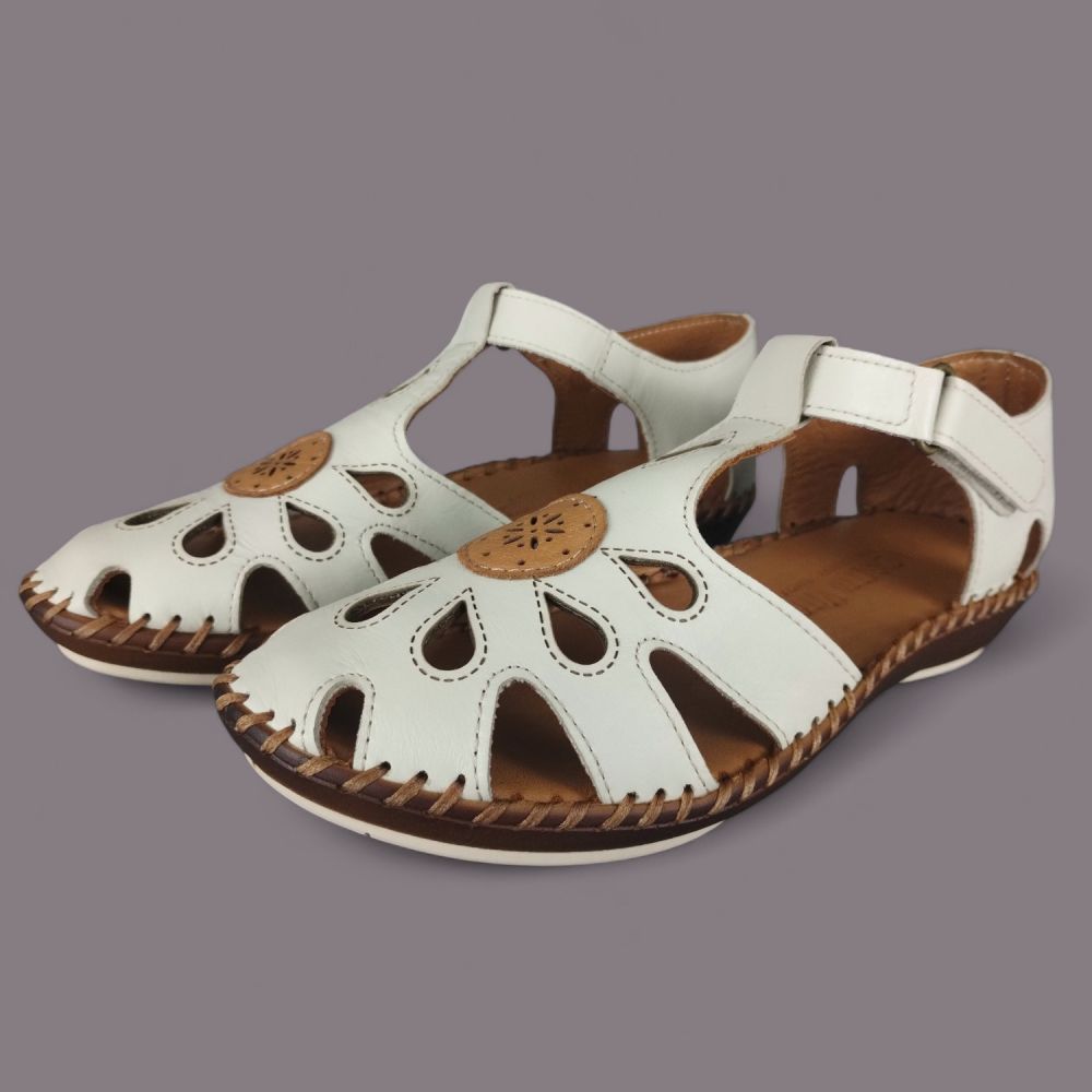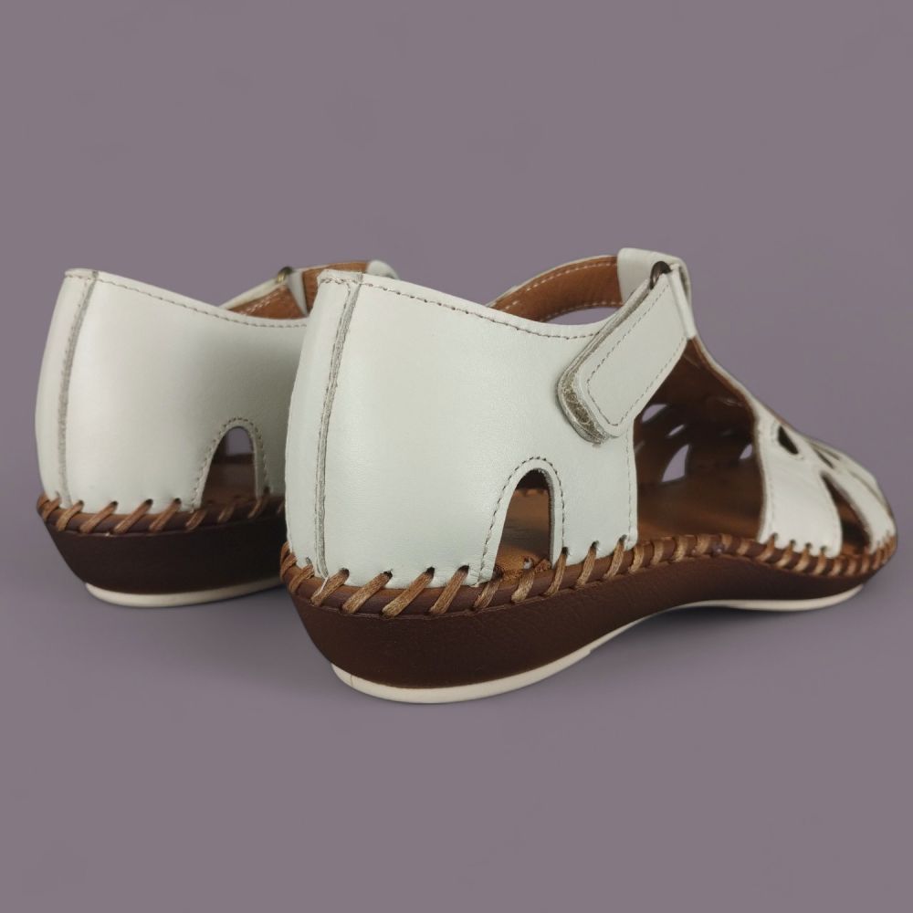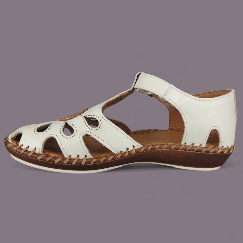 Cholewka wykonana jest ze skóry naturalnej w czystym białym kolorze o gładkiej, delikatnie błyszczącej powierzchni. Biała skóra naturalna nadaje sandałowi lekkości i świeżości — to kolor który optycznie wydłuża nogę i pasuje do praktycznie każdej letniej stylizacji. Skóra jest miękka i elastyczna, dopasowuje się do kształtu stopy z czasem użytkowania.