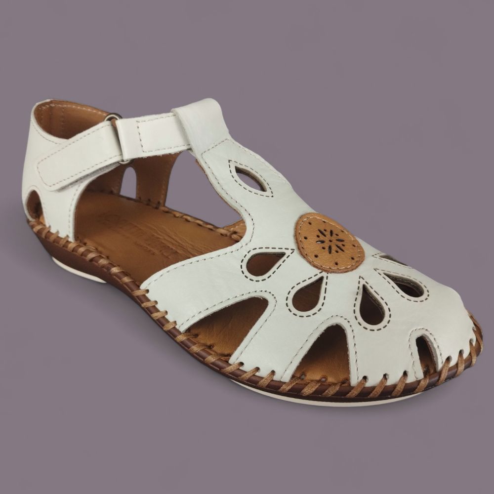 Jasno szara skóra naturalna, karmelowy medalion z kwiatowym tłoczeniem i beżowy ścieg wzdłuż brązowej podeszwy — Loretta Vitale T5204 to sandał który łączy czystość bieli z ciepłem naturalnych brązów. Identyczna rzemieślnicza konstrukcja jak w modelach tej marki, tym razem w ponadczasowej szaro-brązowej kolorystyce która pasuje do wszystkiego.