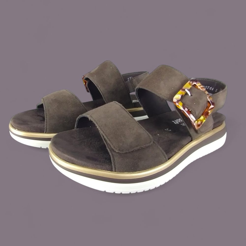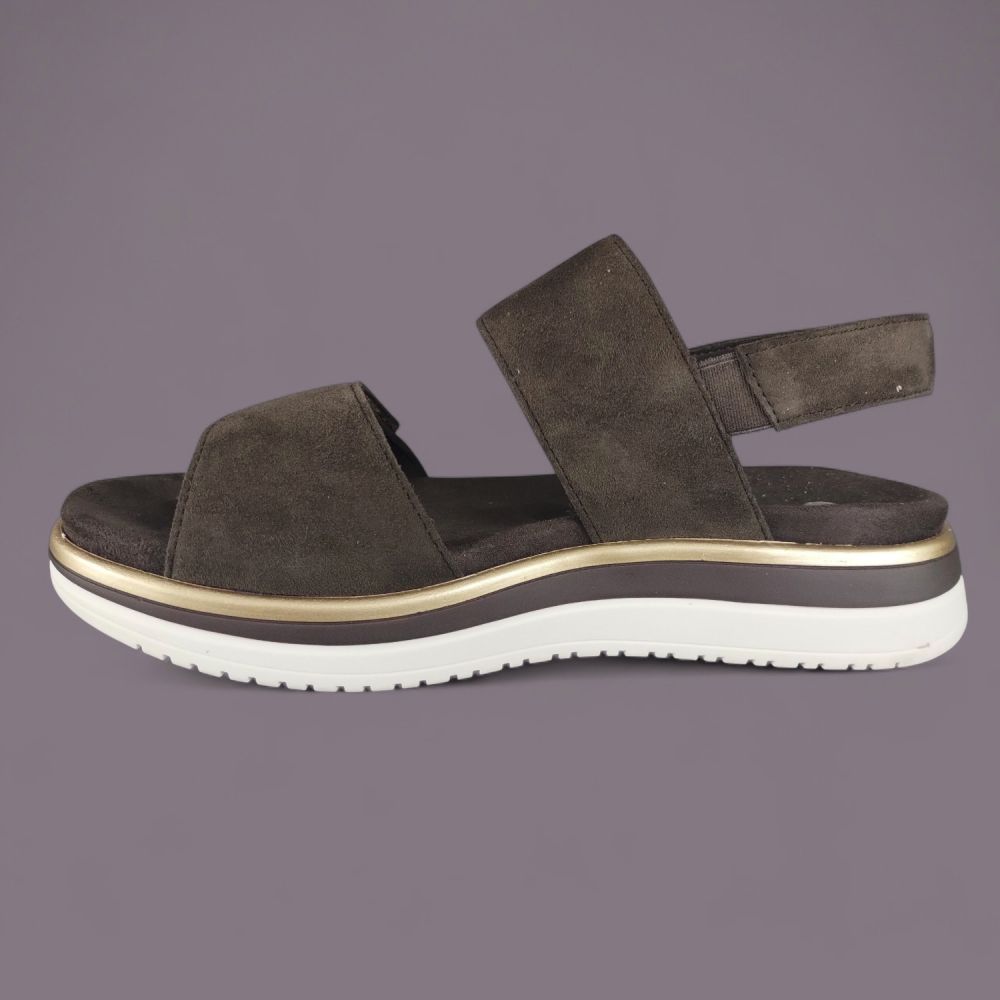 Ciemnobrązowy zamsz, kwadratowa klamra w stylu tortoise shell i złoty pasek wzdłuż podeszwy — model Remonte D1J62-25 to sandał który wygląda jak wyjęty z okładki magazynu modowego. Połączenie naturalnego zamszu z efektowną klampą szylkretową i technologią Lite'n Soft sprawia że but jest równie stylowy co wygodny.