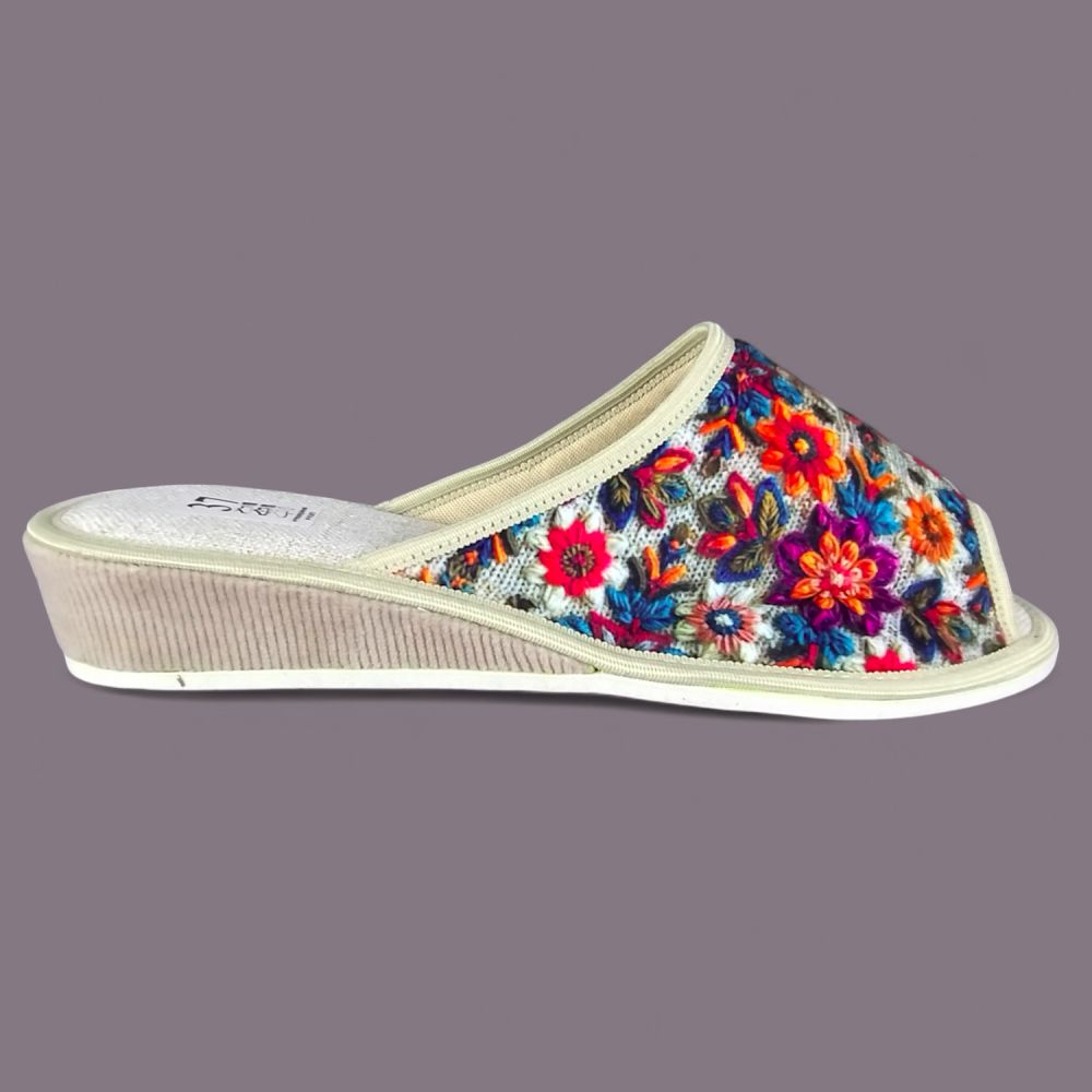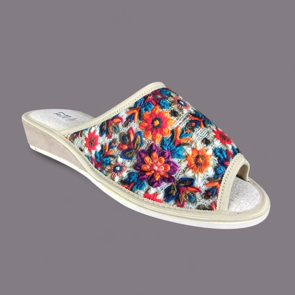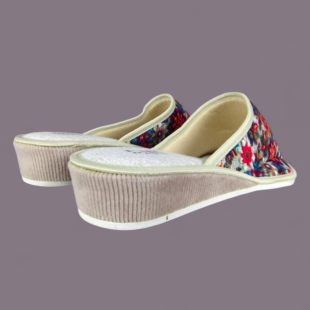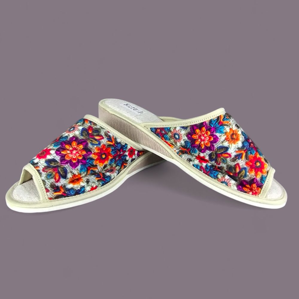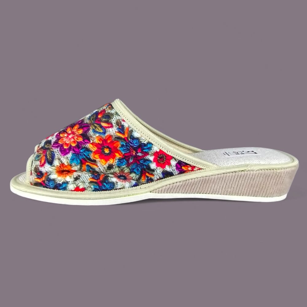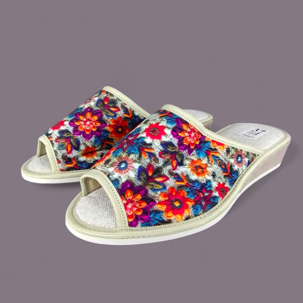 Kapcie domowe damskie z Wkładką Lnianą – Wielobarwne Kwiaty, Klin 3,5cm, Polskie Wykonanie