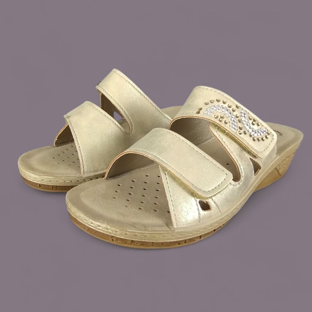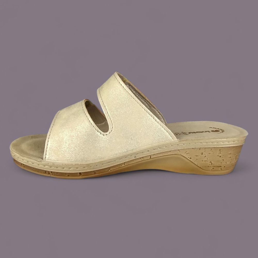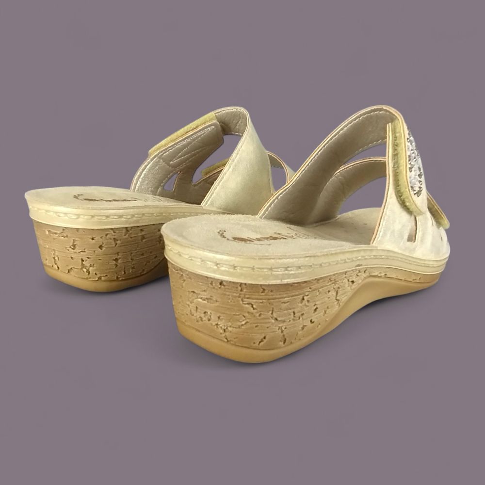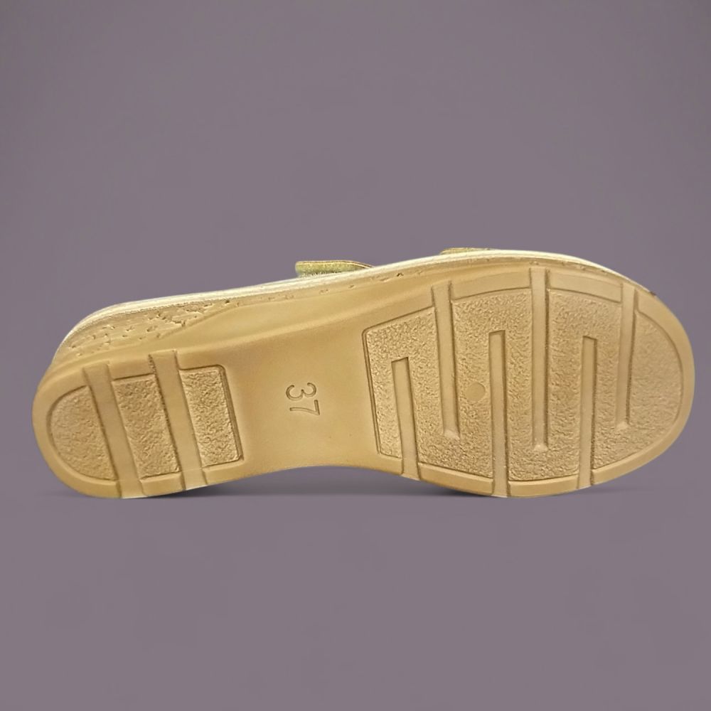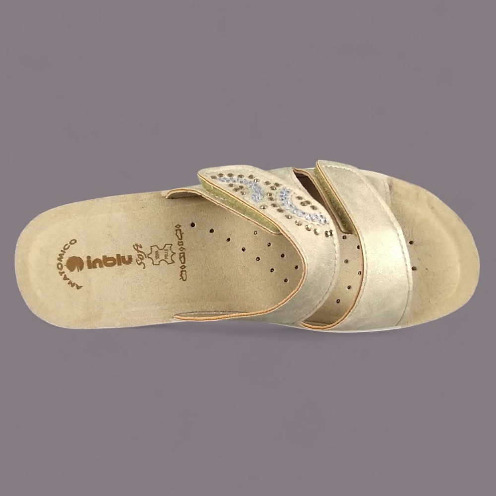 Złoto-srebrne dżety układające się w falisty wzór na szerokim pasie, metaliczna piaskowo-złota ekoskóra i koturna imitująca naturalny korek — klapki Inblu PV000015 to włoskie obuwie letnie które wygląda jak biżuteria na stopie. Do tego wkładka Soft Anatomico z prawdziwej skóry naturalnej która sprawia że but jest równie wygodny co efektowny.