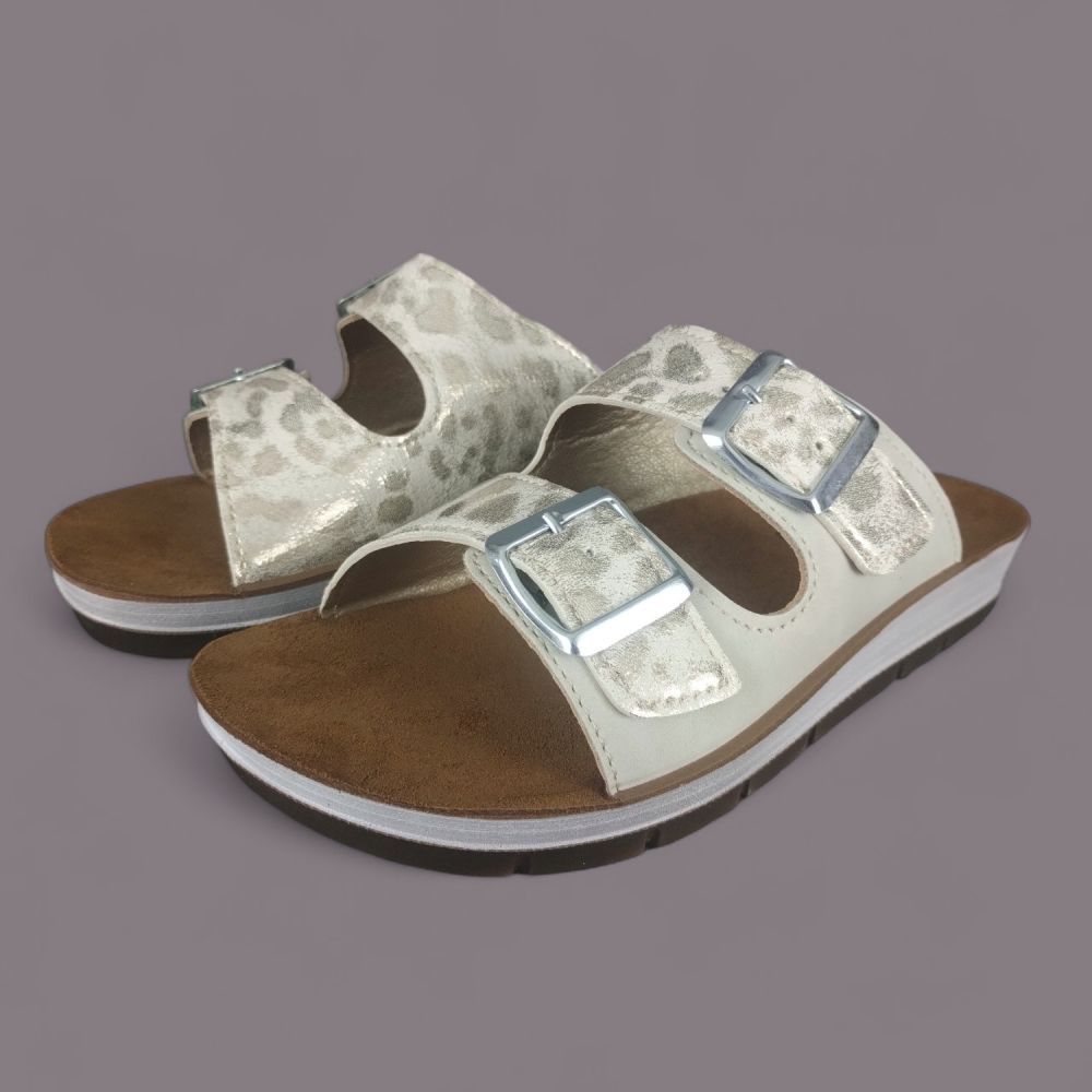 Układ dwóch pasów z regulowanymi klampami nawiązuje do klasycznego wzornictwa obuwia zdrowotnego w stylu Birkenstock — sprawdzonego fasonu który od dekad doceniany jest za wygodę i ergonomię. W wersji Inblu ten klasyczny układ otrzymuje metaliczny animal print i srebrne klamry — nowoczesna reinterpretacja ponadczasowego designu.
