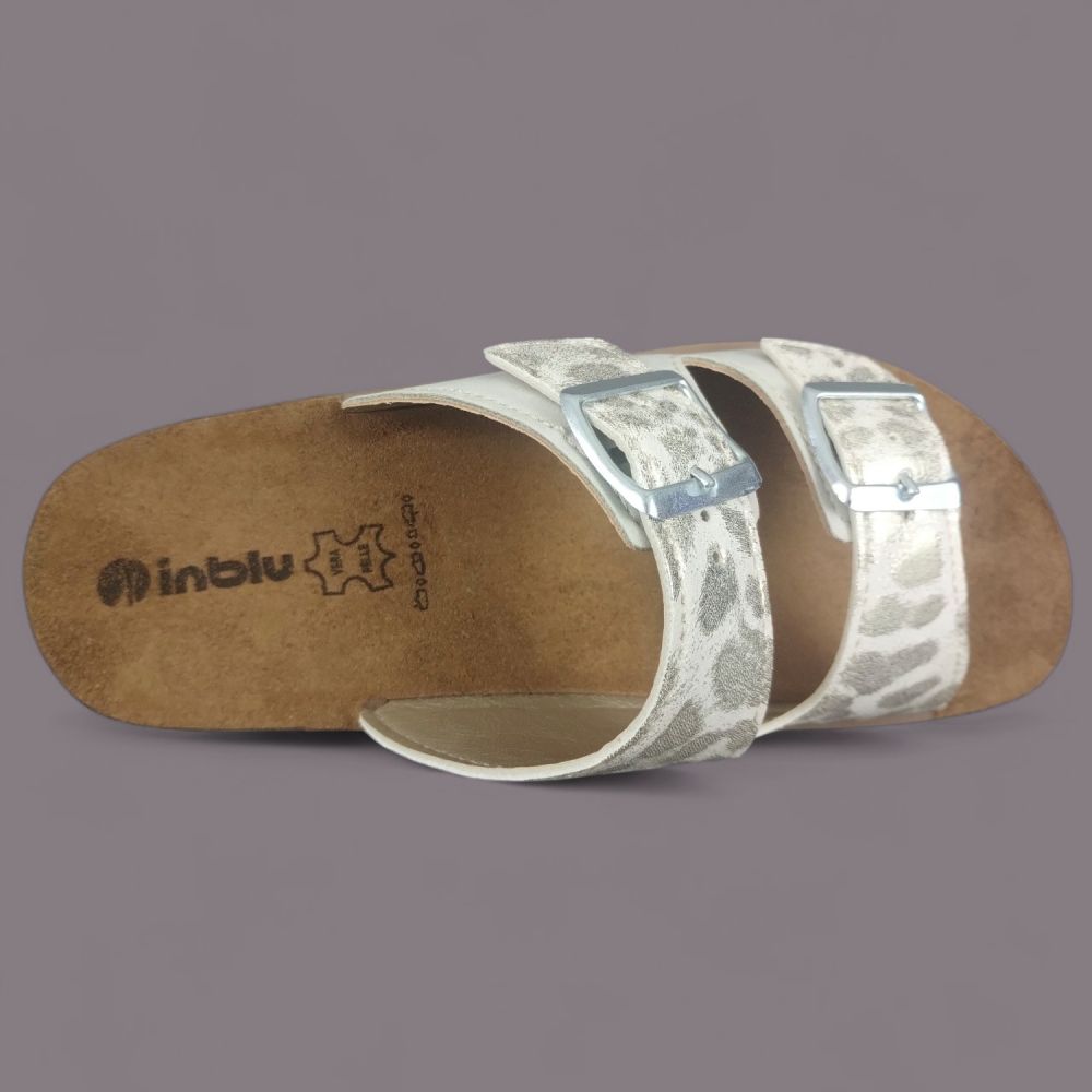 Srebrno-biały metaliczny nadruk w wzór pantery, dwie kwadratowe srebrne klamry i anatomiczne wyżłobienia pod pięty — klapki Inblu CP000063 to but który łączy dziką elegancję z przemyślanym komfortem. Włoska jakość Vera Pelle wewnątrz i efektowny animal print na zewnątrz.