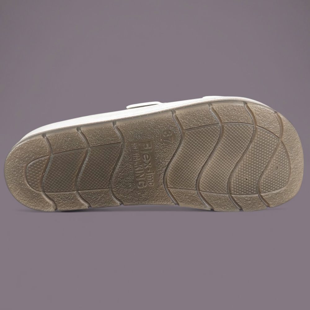 Podeszwa posiada charakterystyczne wyżłobienia w kształcie łódki pod każdą piętę — anatomiczne zagłębienia które idealnie dopasowują się do kształtu pięty i stabilizują stopę przy każdym kroku. To rozwiązanie typowe dla obuwia ortopedycznego i profilaktycznego które trafiło do klapek casualowych — realna korzyść zdrowotna ukryta pod efektownym wyglądem.