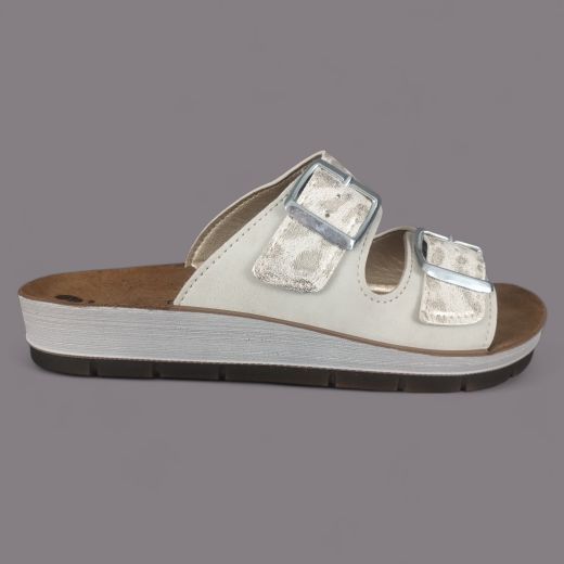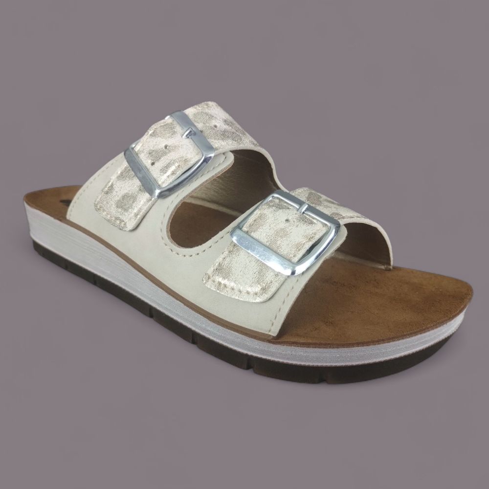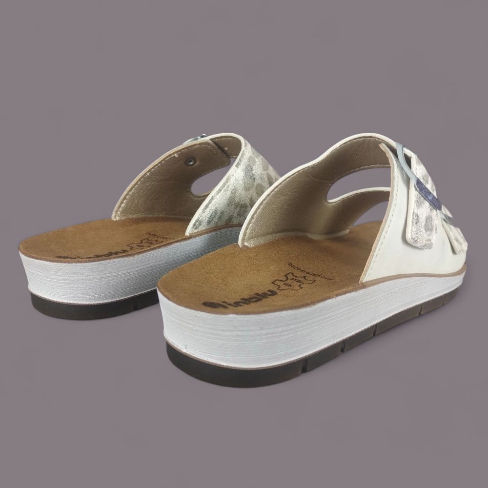 Klapki damskie Inblu CP000063 Białe – Ekoskóra Pantera, Dwie Srebrne Klamry, Vera Pelle