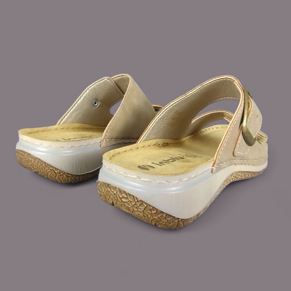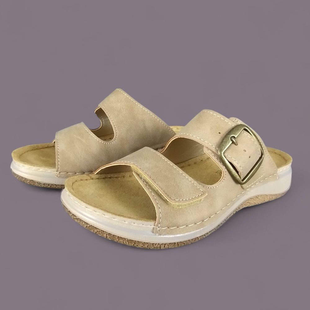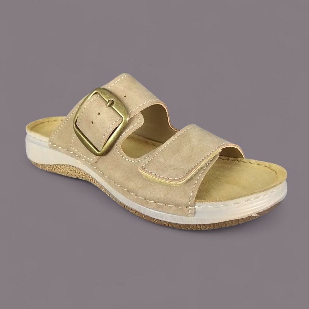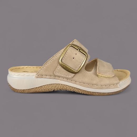 Klapki damskie Inblu LL000006 Beżowe – Ekoskóra Nubuk, Złota Klamra, Vera Pelle