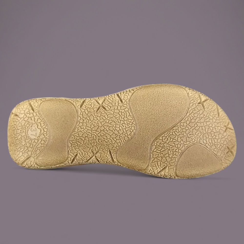 Szeroki pas na podbiciu zdobi duża kwadratowa klamra w kolorze antycznego złota z matowym wykończeniem — masywna i wyrazista, ale nie krzykliwa. Klamra pełni funkcję regulacyjną pozwalając precyzyjnie dopasować szerokość pasa do różnych typów stopy. Antyczne złoto to ciepły, elegancki odcień który pięknie kontrastuje z beżową ekoskórą nubukową.