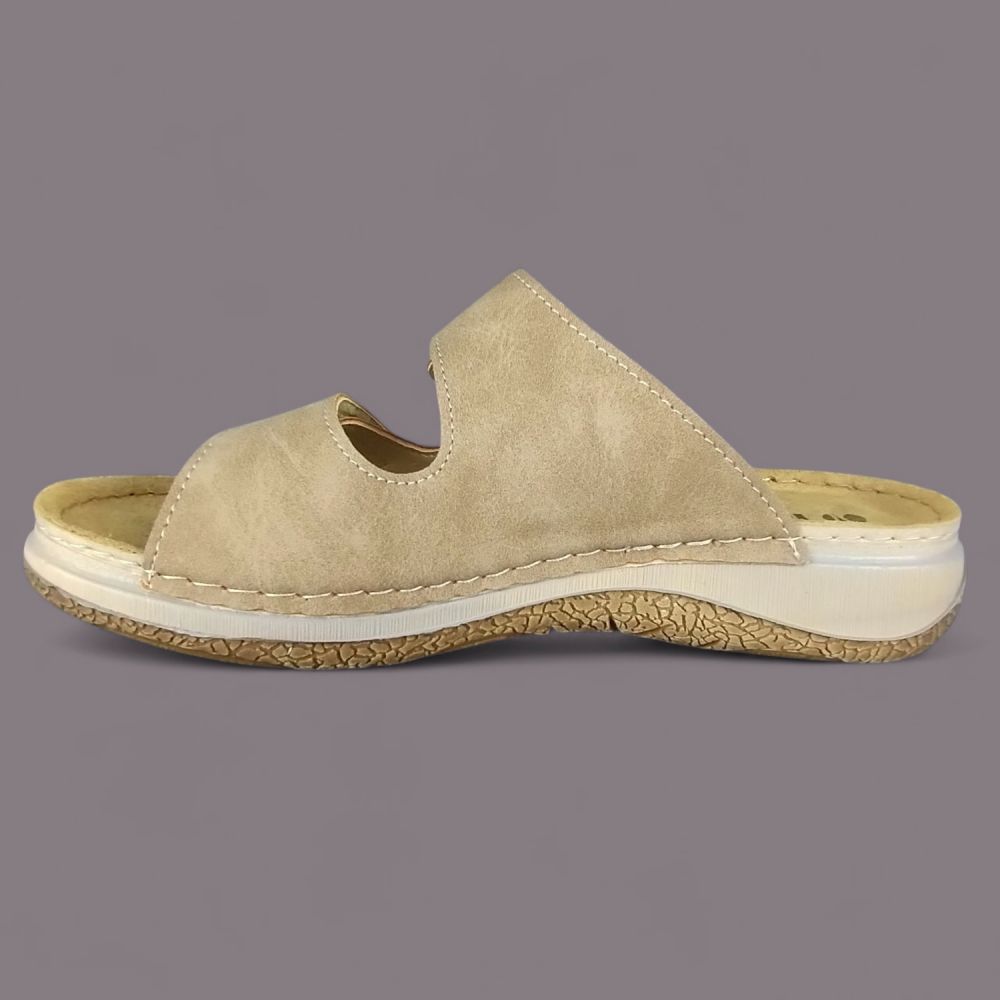 Oba pasy klapki wykonane są z miękkiego materiału imitującego nubuk — aksamitna matowa powierzchnia jest przyjemna w dotyku i nie powoduje otarć. W odróżnieniu od prawdziwego zamszu ekoskóra nubukowa jest odporna na zabrudzenia i nie wymaga specjalnych preparatów — wystarczy wilgotna ściereczka. Ciepły beżowo-taupe kolor to odcień który pasuje do wielu letnich stylizacji.