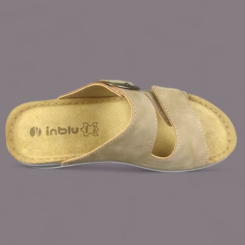 Szeroki pas z dużą kwadratową klamrą w kolorze antycznego złota, miękka ekoskóra nubukowa i wkładka z prawdziwej skóry naturalnej Vera Pelle — klapki Inblu LL000006 to włoskie obuwie letnie które stawia na komfort i styl jednocześnie. But który wygląda elegancko a wkłada się w ułamku sekundy.