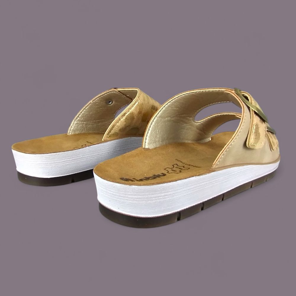 Rose gold — kolor który od kilku sezonów nie schodzi z okładek magazynów modowych. Metaliczna ekoskóra w ciepłym różowo-złotym odcieniu z klamrami w antycznym złocie i brązową zamszową wkładką Vera Pelle — klapki Inblu CP000063 w tej wersji kolorystycznej mają w sobie coś z biżuterii. Romantyczne złoto na stopie z włoską dbałością o komfort.