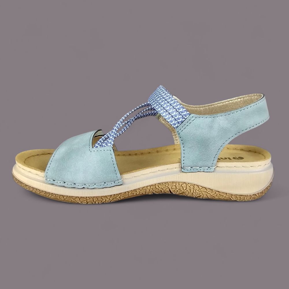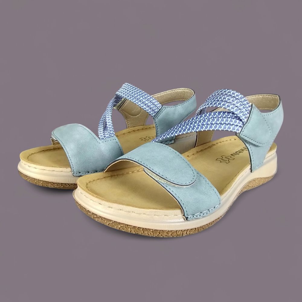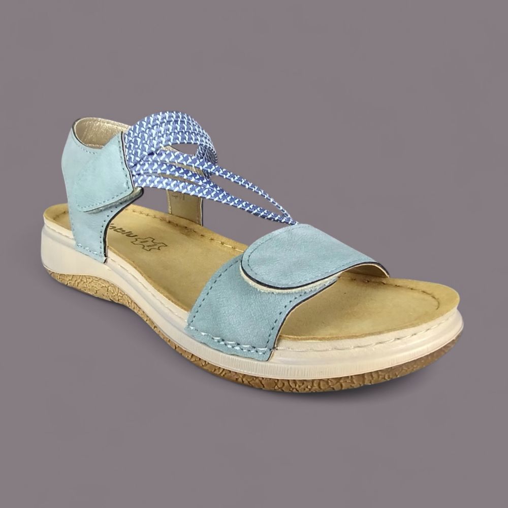 Centralnym elementem sandała są trzy równoległe elastyczne gumki z metalicznym niebieskim plecionym wzorem które biegną ukośnie przez podbicie. Metaliczny połysk plecionek kontrastuje z matową nubukową ekoskórą tworząc efektowną grę faktur. Elastyczność gumek sprawia że but dopasowuje się do różnych wysokości i szerokości podbicia — zakłada się błyskawicznie i nie uciska nawet przy obrzękach w ciągu dnia.