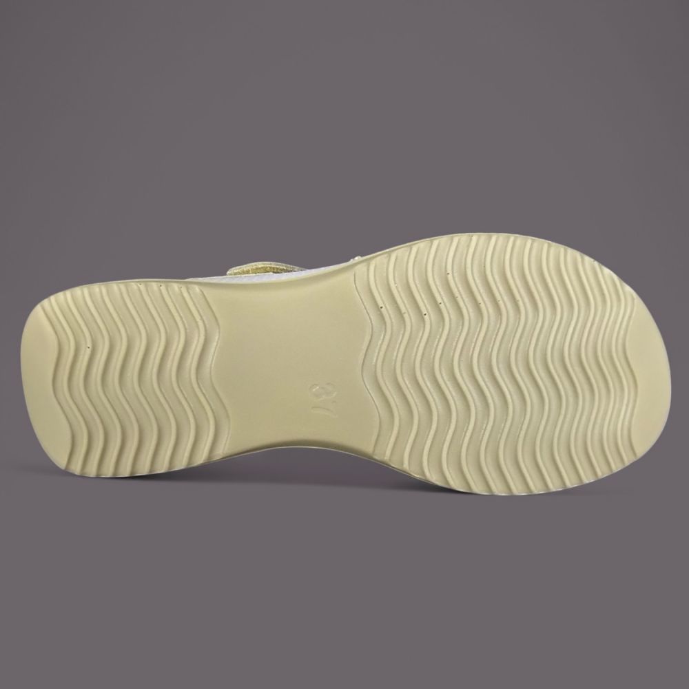 Biała podeszwa z brązowym antypoślizgowym bieżnikiem jest lekka i elastyczna. Nadaje sandałowi sportowo-casualowego charakteru który sprawia że but pasuje zarówno do eleganckich letnich stylizacji jak i do codziennego noszenia w mieście.