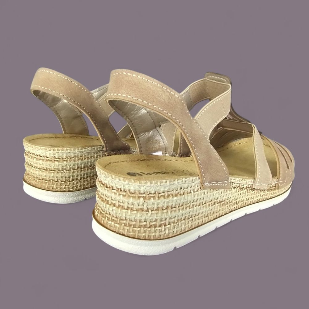 Koturnka o wysokości 4cm to idealne rozwiązanie dla kobiet, które chcą dodać wzrostu bez obciążania stóp. Te sandały są wyjątkowo lekkie — boczna okładzina imituje splot jutowy i nawiązuje do espadrylowej estetyki, ale podeszwa jest syntetyczna i znacznie lżejsza niż w klasycznych espadrylach. Czujesz to od pierwszego kroku.
