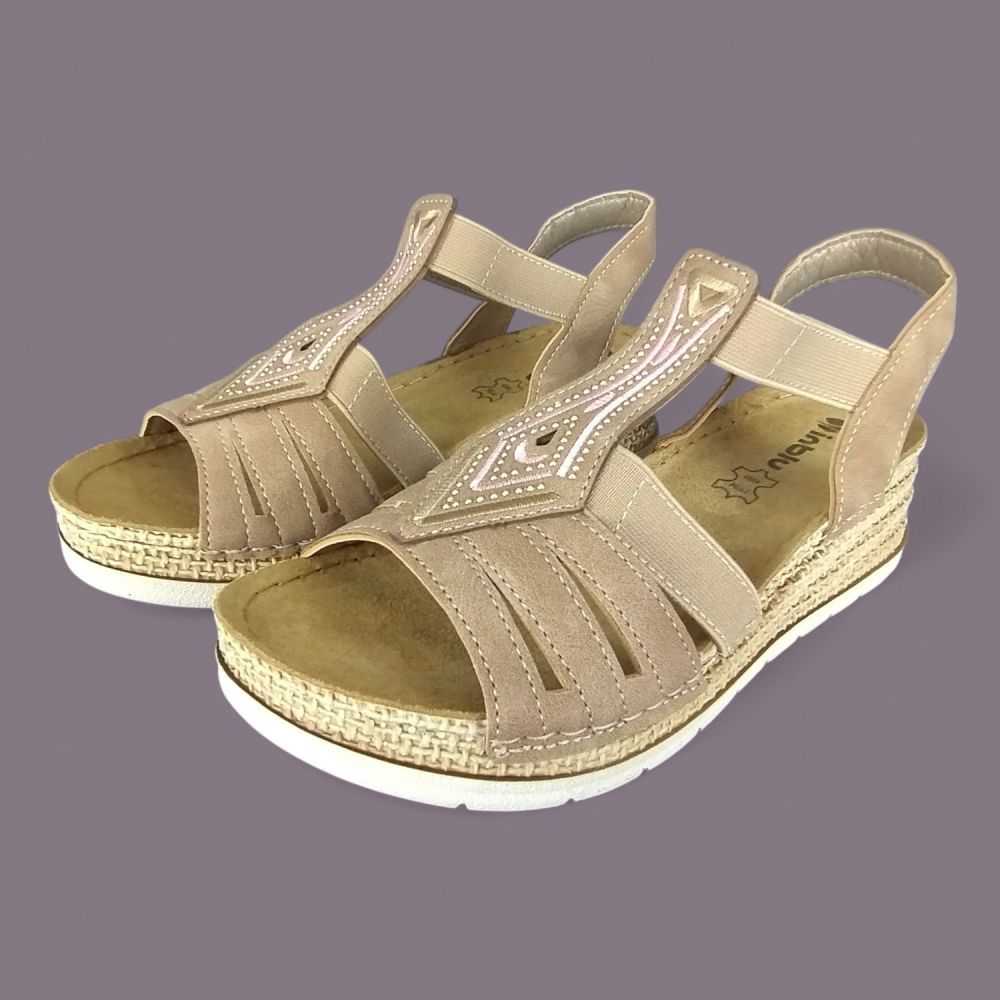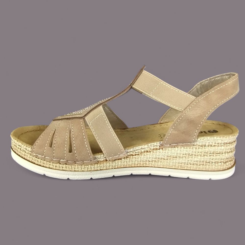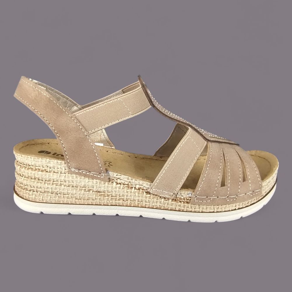 Sandały damskie Inblu RV000018 – jasnobrązowe, ekoskóra nubuk, cyrkonie, koturna 4cm