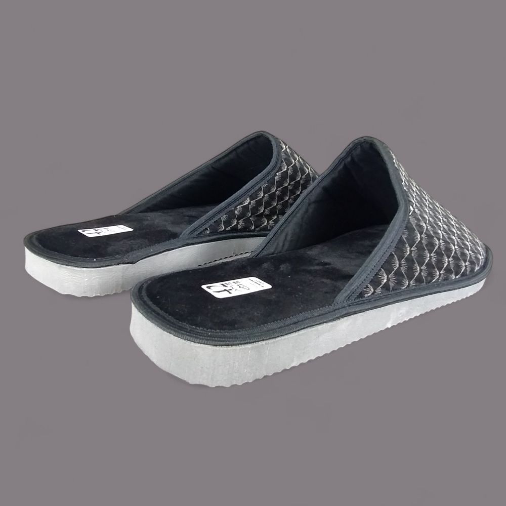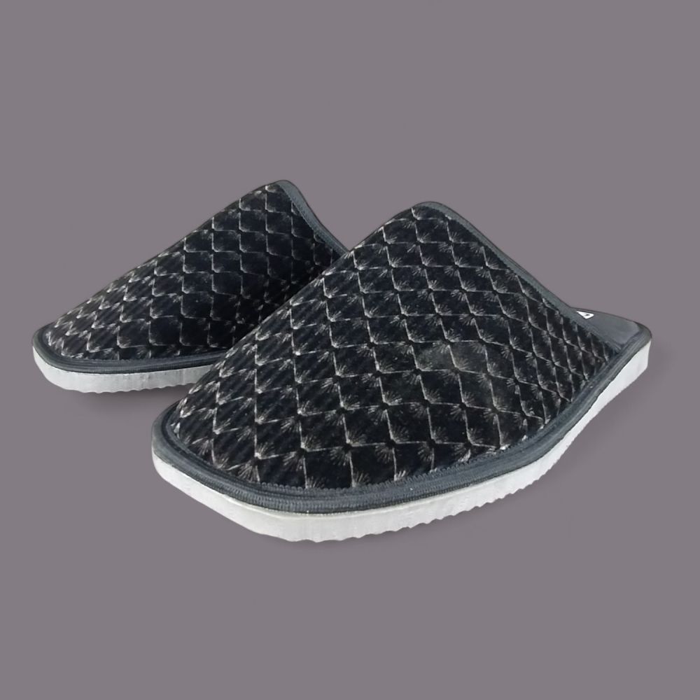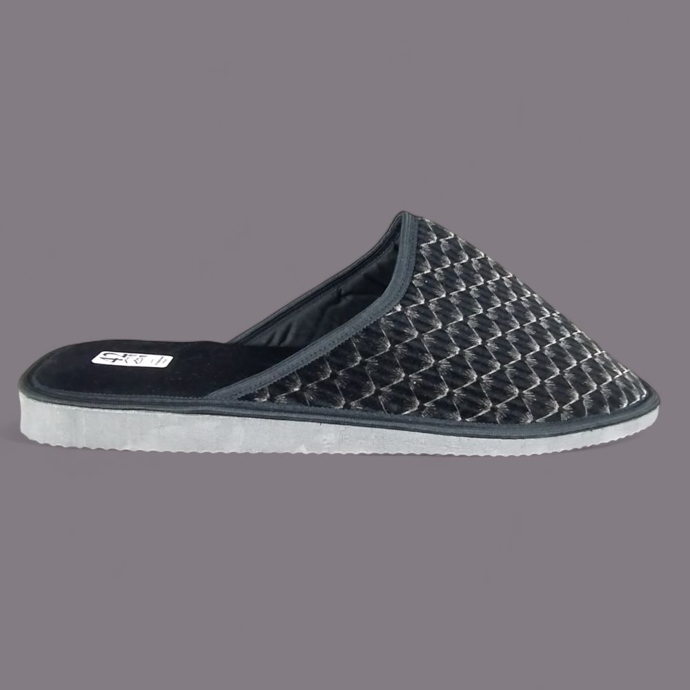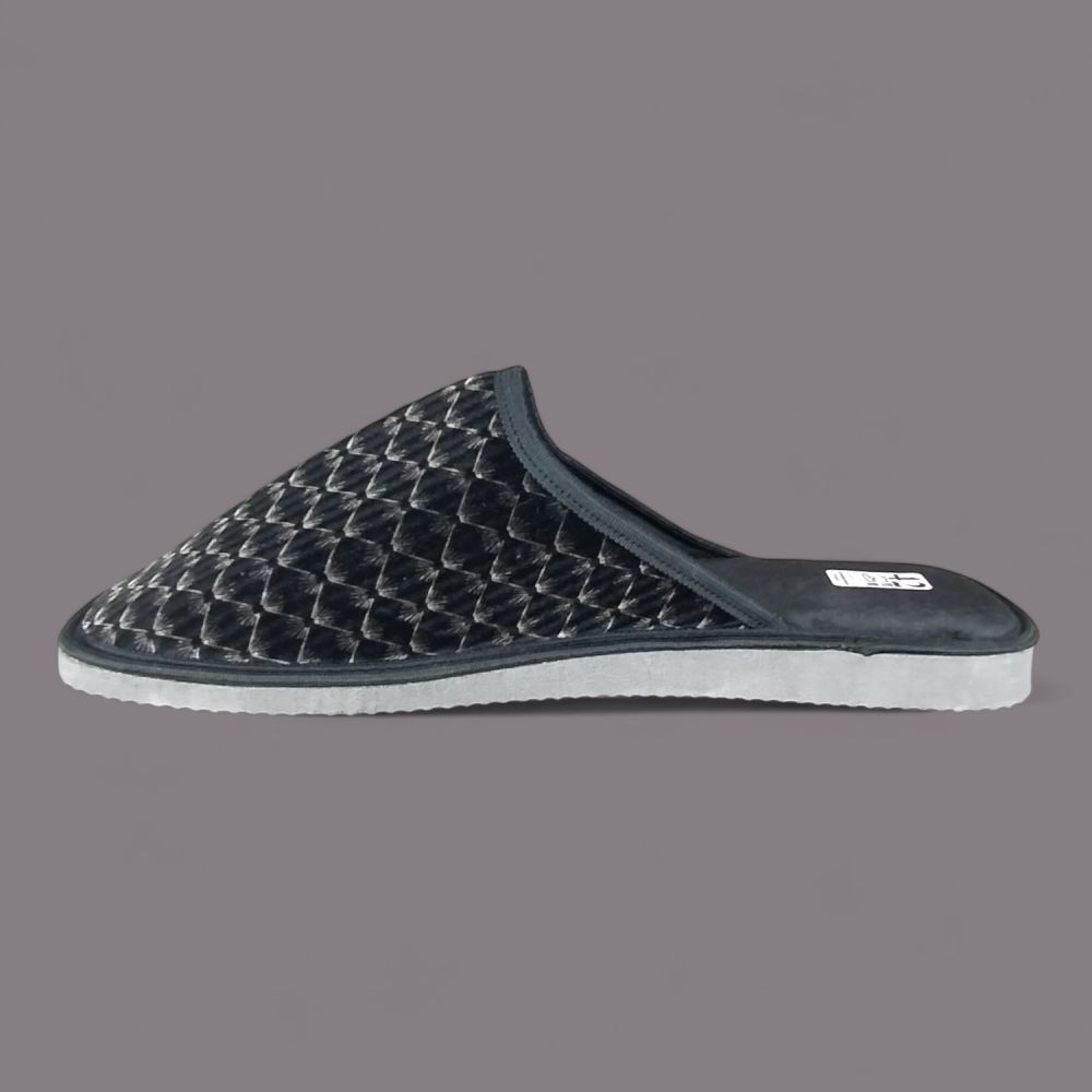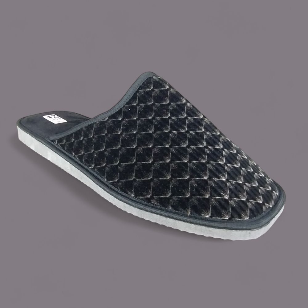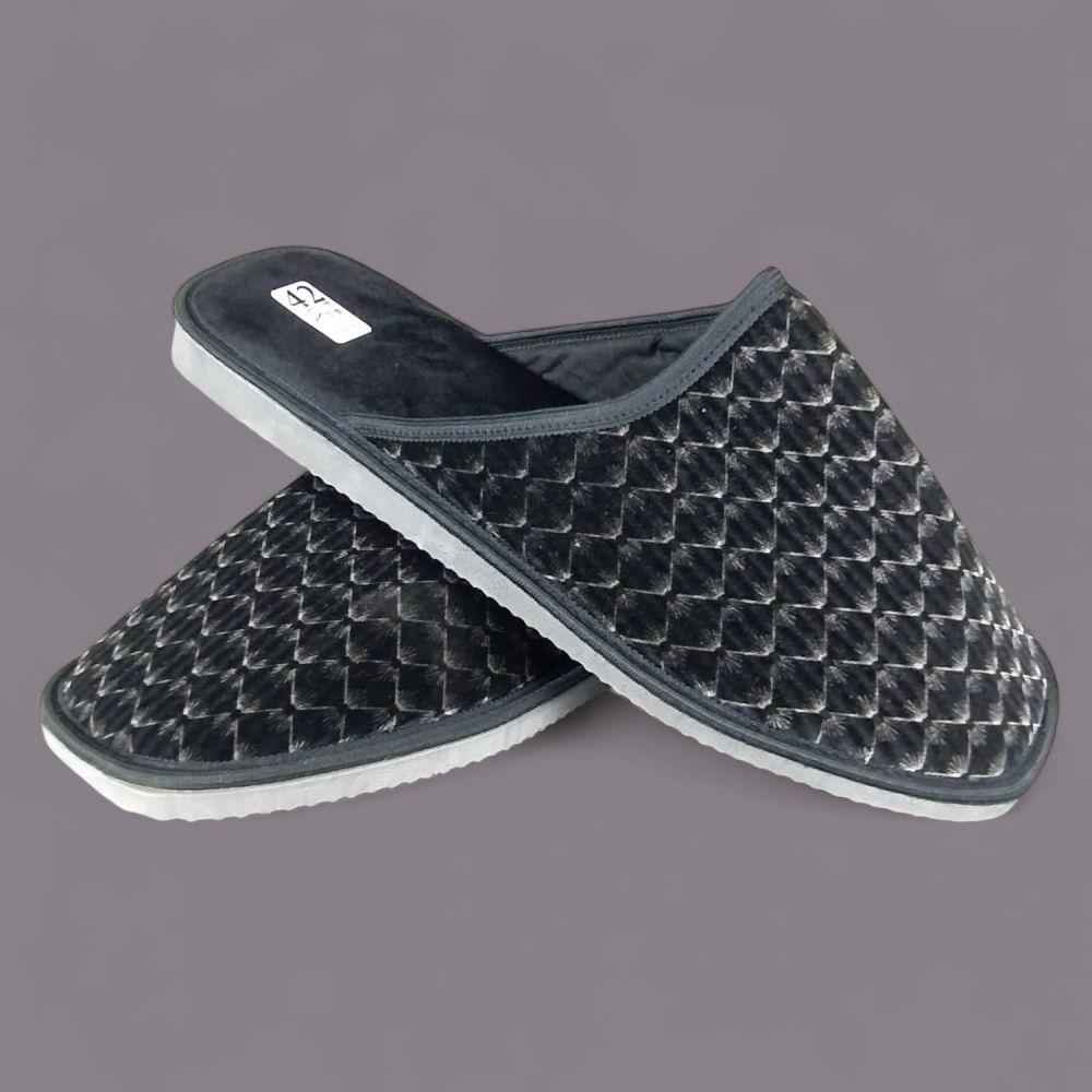 Wierzch wykonany jest z miękkiego weluru — materiału tekstylnego o aksamitnej fakturze, który przyjemnie otula stopę i nie podrażnia skóry. Charakterystyczny wzór w romby nadaje kapciom eleganckiego wyglądu, a ciemna, grafitowo-czarna kolorystyka z delikatnym połyskiem sprawia, że wyglądają znacznie lepiej niż typowe kapcie domowe.