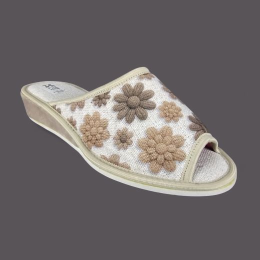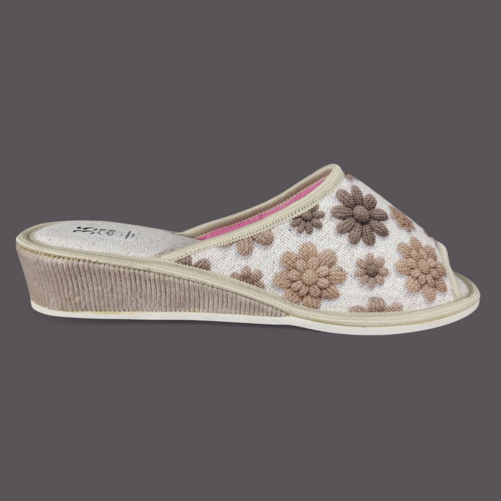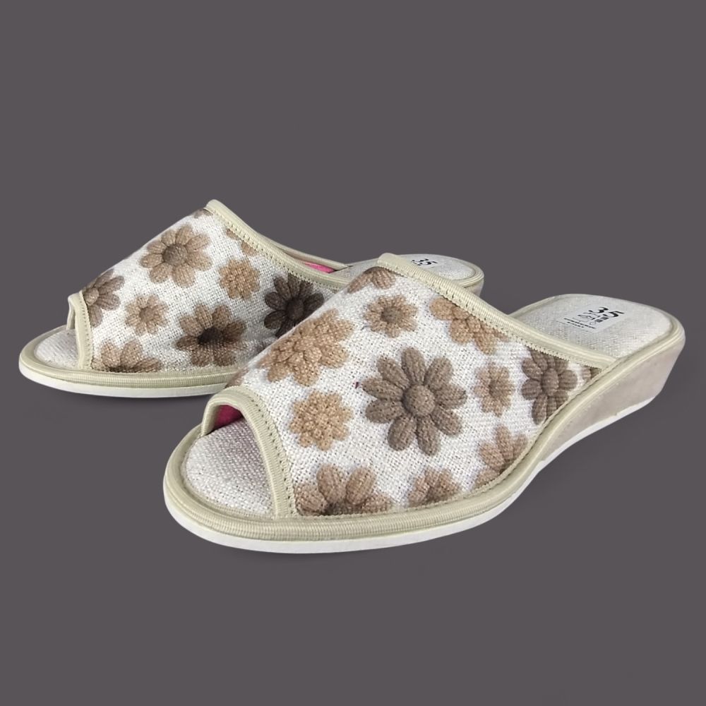Kapcie damskie KD-LEN-04 – wytłaczane kwiaty beżowe, lniana wkładka, koturna 3,5 cm, polskie