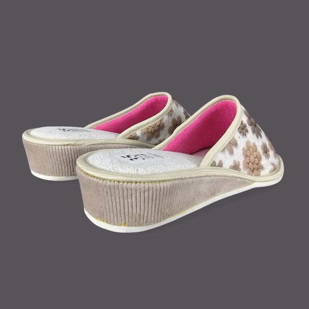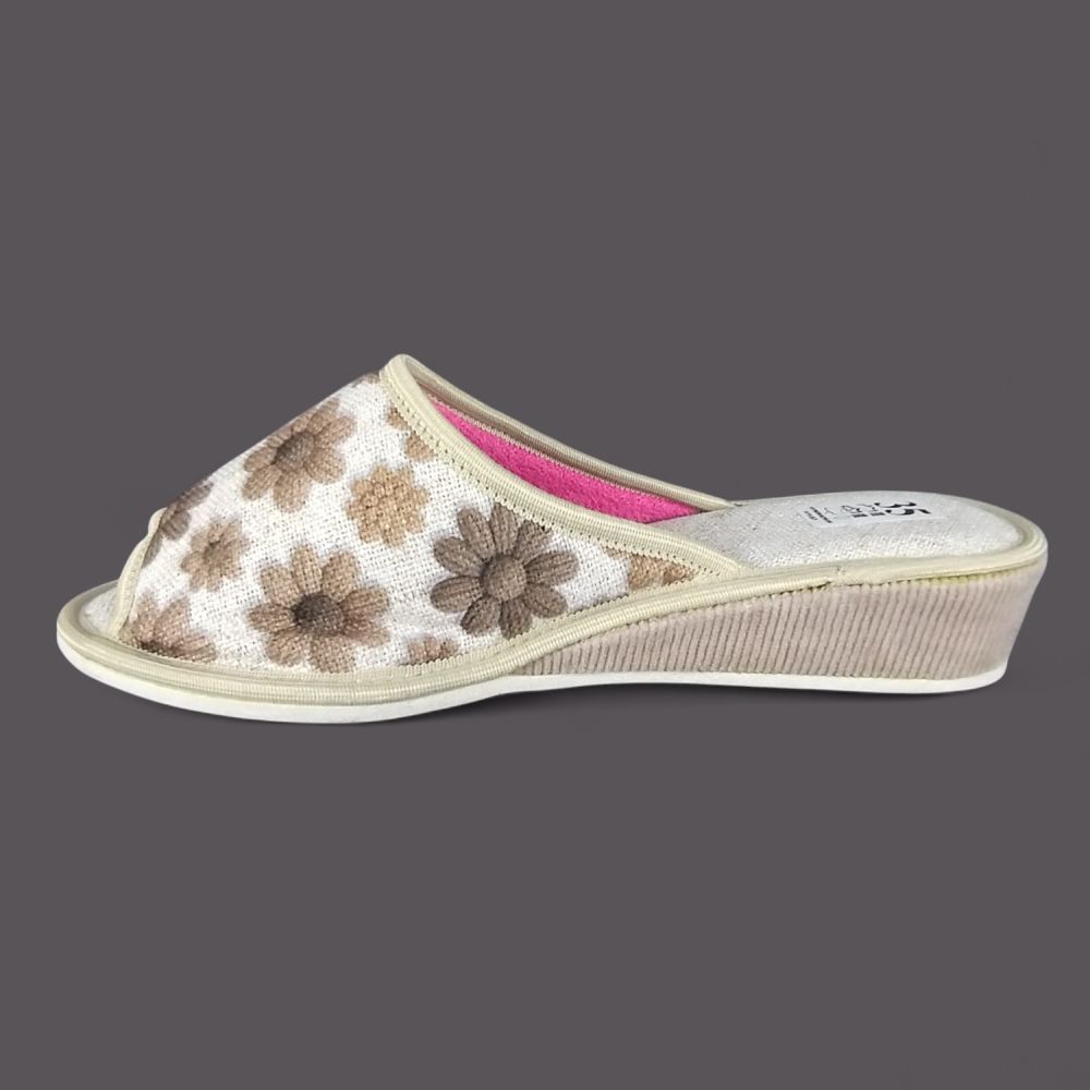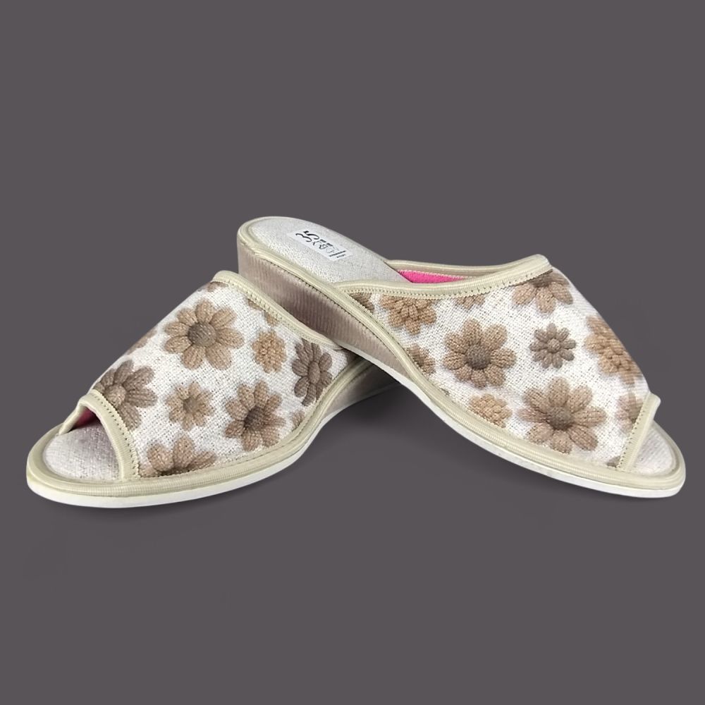 Wzór kwiatowy na wierzchu KD-LEN-04 nie jest zwykłym nadrukiem — kwiaty są wytłoczone w strukturze samej tkaniny, co nadaje im głębi i trójwymiarowości. Ciepłe odcienie beżu i taupe na białym tle tworzą stonowaną, klasyczną kompozycję, która pasuje do każdego domowego wnętrza. Różowe wnętrze kapcia to energetyczny kontrast — ciepły i radosny akcent, który widać przy zakładaniu.