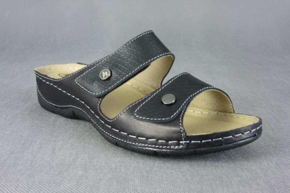 Obuwie firmy Helios wykonane zostało z najwyższej jakości skóry naturalnej. Podeszwy są lekkie i elastyczne wytworzone z wysokiej jakości tworzywa PU odpornego na pękanie. We wszystkich modelach zaprojektowana została dwuwarstwowa bardzo miękka wkładka ze skóry naturalnej, która zapewnia uczucie wygody przez wiele godzin. Cholewka uszyta została z miękkiej skóry naturalnej w kolorze czarnym i posiada regulację za pomocą rzepa, drugi jest przyszyty na stałe. Klapki idealnie sprawdza się w sezonie letnim. Eleganckie wzornictwo opracowano w oparciu o najnowsze trendy mody, w połączeniu z wysoką jakością wykonania oraz dbałością o komfort użytkowania dostarczy wiele zadowolenia. Klapki na upalne dni, na wakacyjny wyjazd, z powodzeniem można je nosić do spodni oraz do spódniczki.